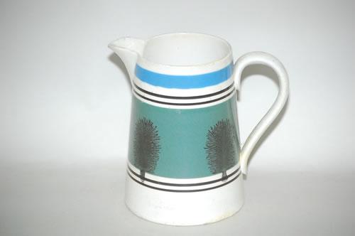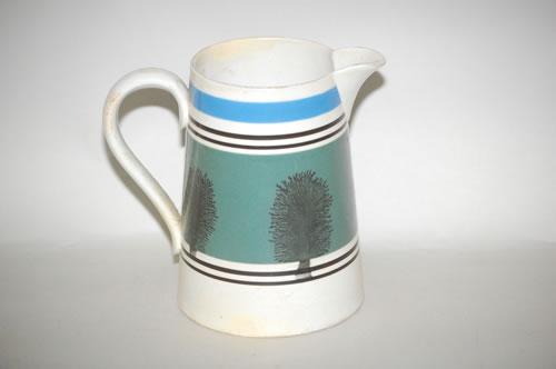 IMPERIAL SEAWEED MOCHA PITCHER - 6 1/2" BETA SHAPED MOCHA PITCHER W/ LG. BLUE GREEN BAND W/ SEAWEED W/ UPPER BLUE BAND & PAIRED BROWN BAND SEPARATORS (6 1/2" T X 7" W W/ HANDLE; 1 QUART)-BASE RIM & HANDLE REPAIRS, STAIN, IMPERFECTIONS