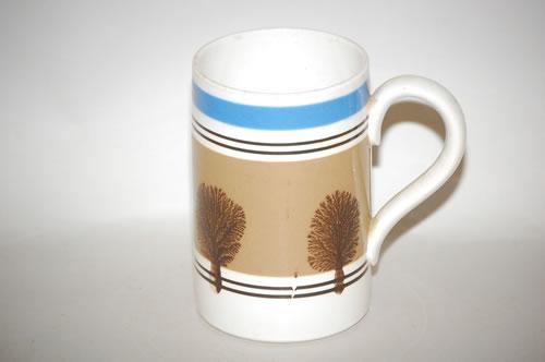 IMPERIAL SEAWEED MOCHAWARE TANKARD - 5 1/8" MOCHA TANKARD W/ WIDE DARK PUTTY COLORED BAND W/ SEAWEED DECORATION W/ UPPER BLUE BAND & PAIRED BROWN BAND SEPARATORS (5 1/8" T X 5 1/2" W W/ HANDLE; 1 PINT)- MINOR IMPERFECTIONS