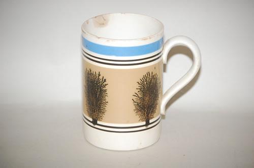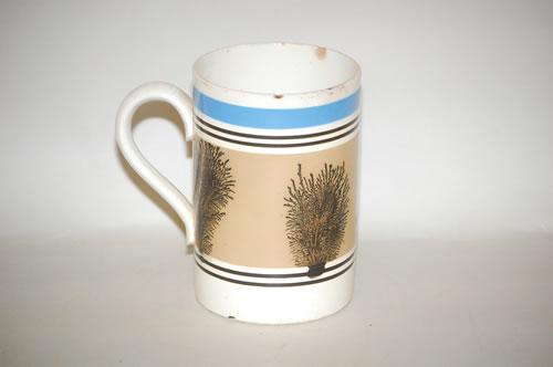 IMPERIAL SEAWEED MOCHAWARE TANKARD - 6 1/4" MOCHA TANKARD W/ LARGE PUTTY COLORED BAND W/ SEAWEED DECORATION W/ UPPER BLUE BAND & PAIRS OF BROWN BAND SEPARATORS (6.25"T X 6.5"W W/ HANDLE; 1 QT.)-TOP RIM & HANDLE CHIPS, CRAZING, IMPERFECTIONS