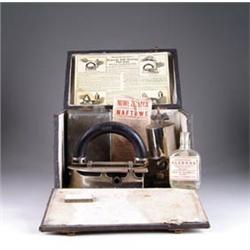 IMPERIAL SELF HEATING FLAT IRON W/ CASE. Gas powered nickel-plated iron with rear fuel receptacle. Marked "Imperial Brass Mfg. Co., Chicago" in relief. Comes with original cloth covered carrying case, direction card, cleaning brush and other accessories. SIZE: Case measures 11" l x 9" w x 7" d. CONDITION: Some nickel loss, otherwise very good. 1-1909