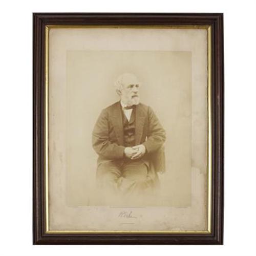<B>IMPERIAL SIZE PHOTOGRAPH OF GENERAL LEE BY GARDNER, 1866.</B></I> Very rare, large format framed albumen photograph in its original frame (approximately 18" x 24”) of General Robert E. Lee as president of Washington College, taken during his visit to Washington D.C. after the Civil War by the famous photographer Alexander Gardner in 1866. This imperial (mammoth plate) size photograph is a rare find. <BR><BR><B>Condition:</B></I> Fine, a little light on contrast, has some soiling on card.<BR><BR><b>Shipping:</b> Framed - with Glass, Medium (<a target="_blank" href="http://www.heritageauctions.com/common/shipping.php">view shipping information</a>)
