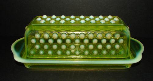 IMPERIAL GLASS CO. OPALESCENT VASELINE GLASS COVERED BUTTER DISH. Hobnailed pattern. Marked on bottom of lid with moulded Imperial mark. 7.5” L