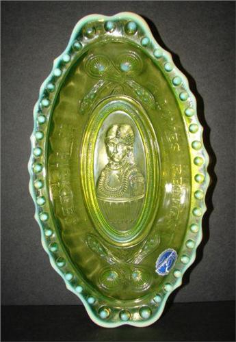 IMPERIAL GLASS CO. OPALESCENT VASELINE GLASS PICKLE DISH. Hobnailed pattern around rim with moulded decoration of female at center with text “Loves Request/Is Pickles”. Retains Imperial sticker and has moulded Imperial mark at bottom. 1.5” H, 9” L