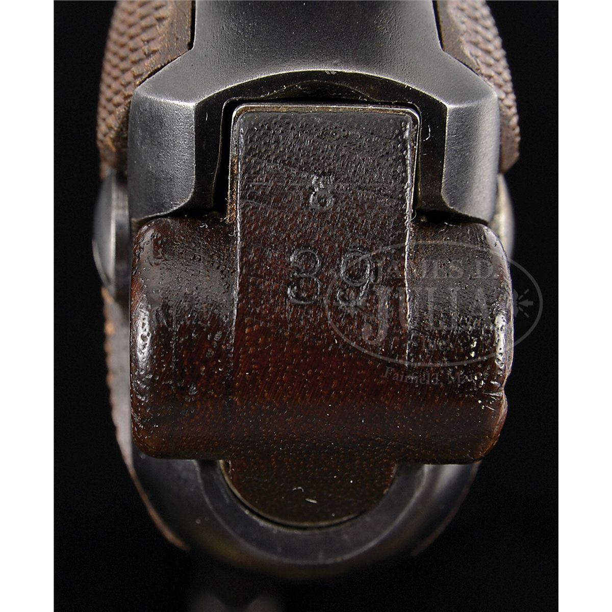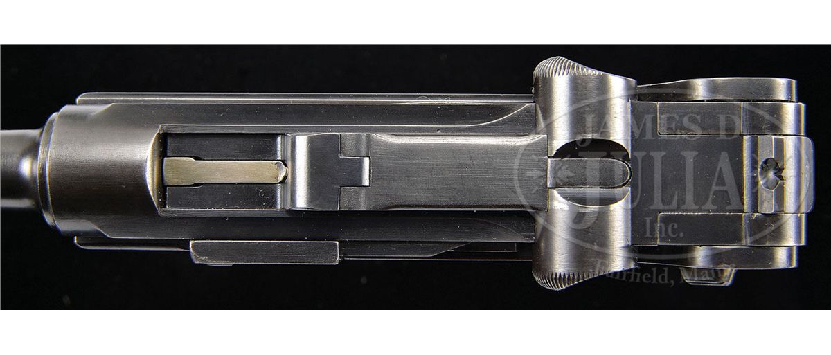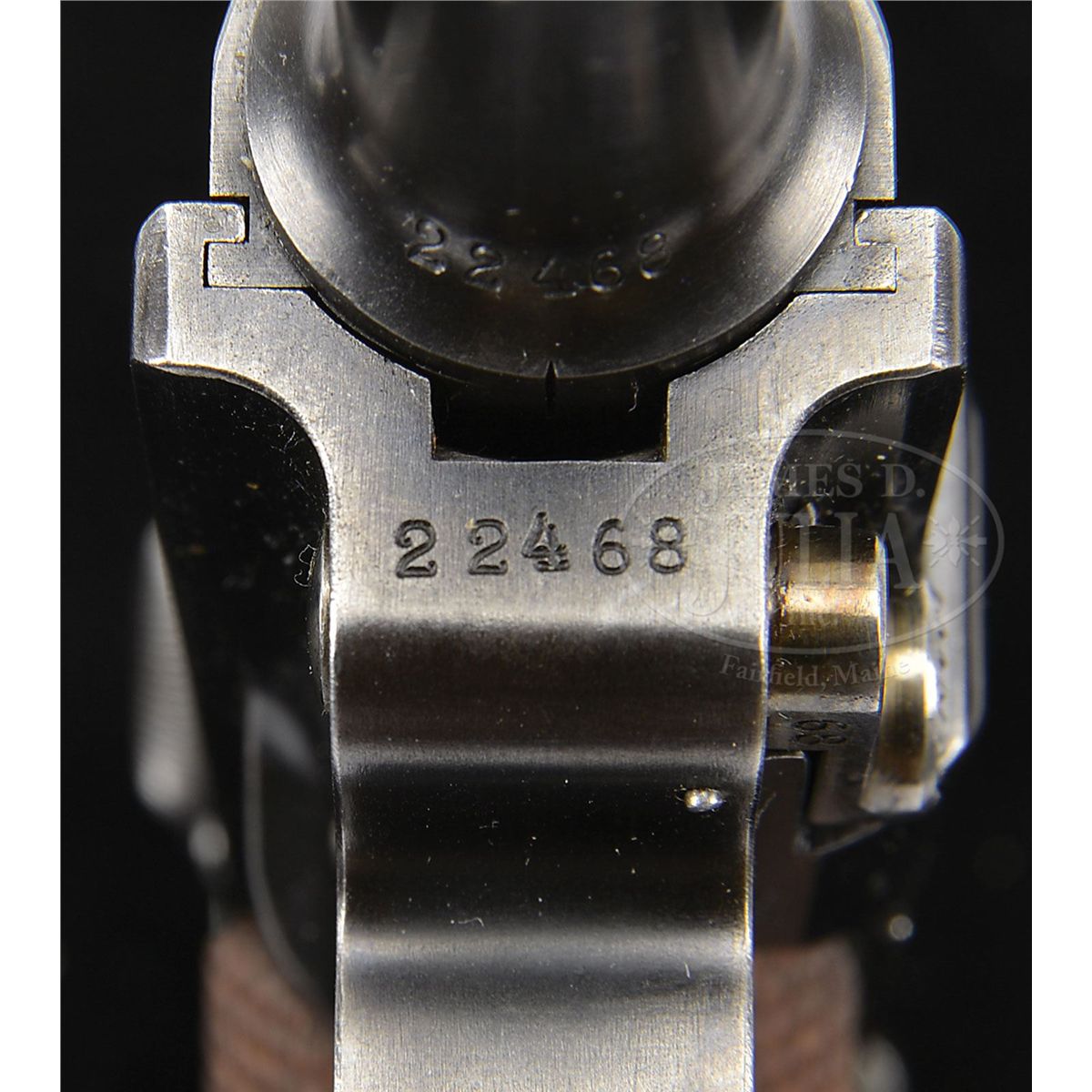SN 22468. 4" 30 Cal. bbl. Blank chamber and center toggle link. Dished toggles. Grip safety. Short frame and receiver with late internal Old Model machining. Crown/D inspection mark on left side of receiver, this is the highest serial number Dutch trials gun found in the research of the Sturgess book The Borchardt & Luger Automatic Pistols to have this mark, and the only one with higher serial number than the US Powell cartridge counter guns (22400 – 22450)and the late pattern internal machining introduced with the Powell guns. All numbered parts are matching including the checkered walnut grips, which have three digit serial numbers as do the sideplate and the rear toggle link. This gun is featured on pp. 96, 223, 225, 227, 229, 289, 290, 462, 567, and 600 of Dr. Geoffrey Sturgess' book. This is a very rare configuration of calibre, barrel and frame length, only 109 of which were made for Dutch trials and delivered in March/July 1905. PROVENANCE: Collection of Dr. Geoffrey Sturgess. CONDITION: Excellent. Retains 97% orig blue and 90% orig straw. Bore is bright and sharp. Grips are lightly worn and show nice color. Magazine is excellent with a couple of very minor chips on the wood bottom. Mechanics are excellent. 4-52757 BWS84