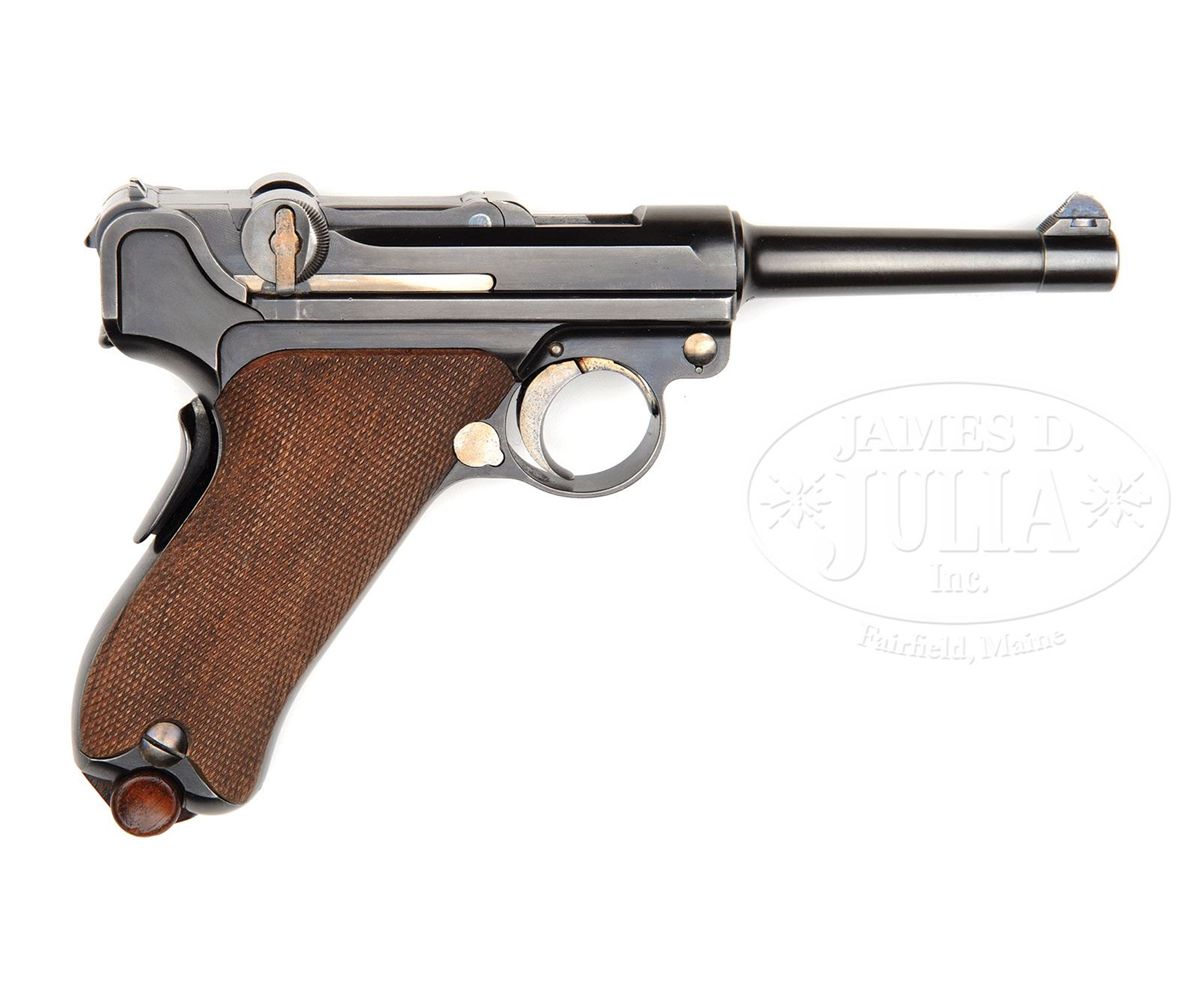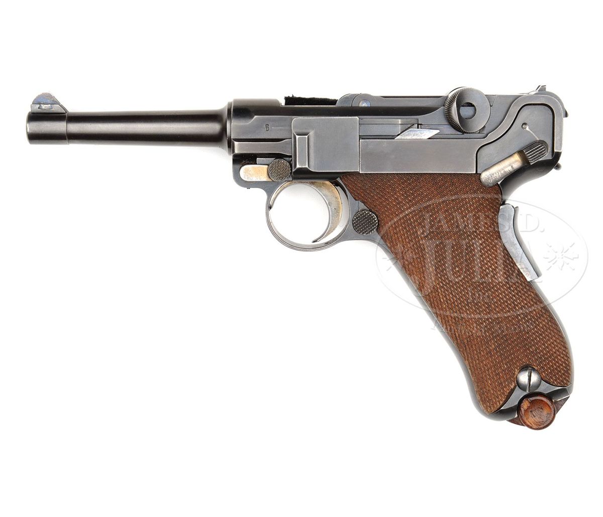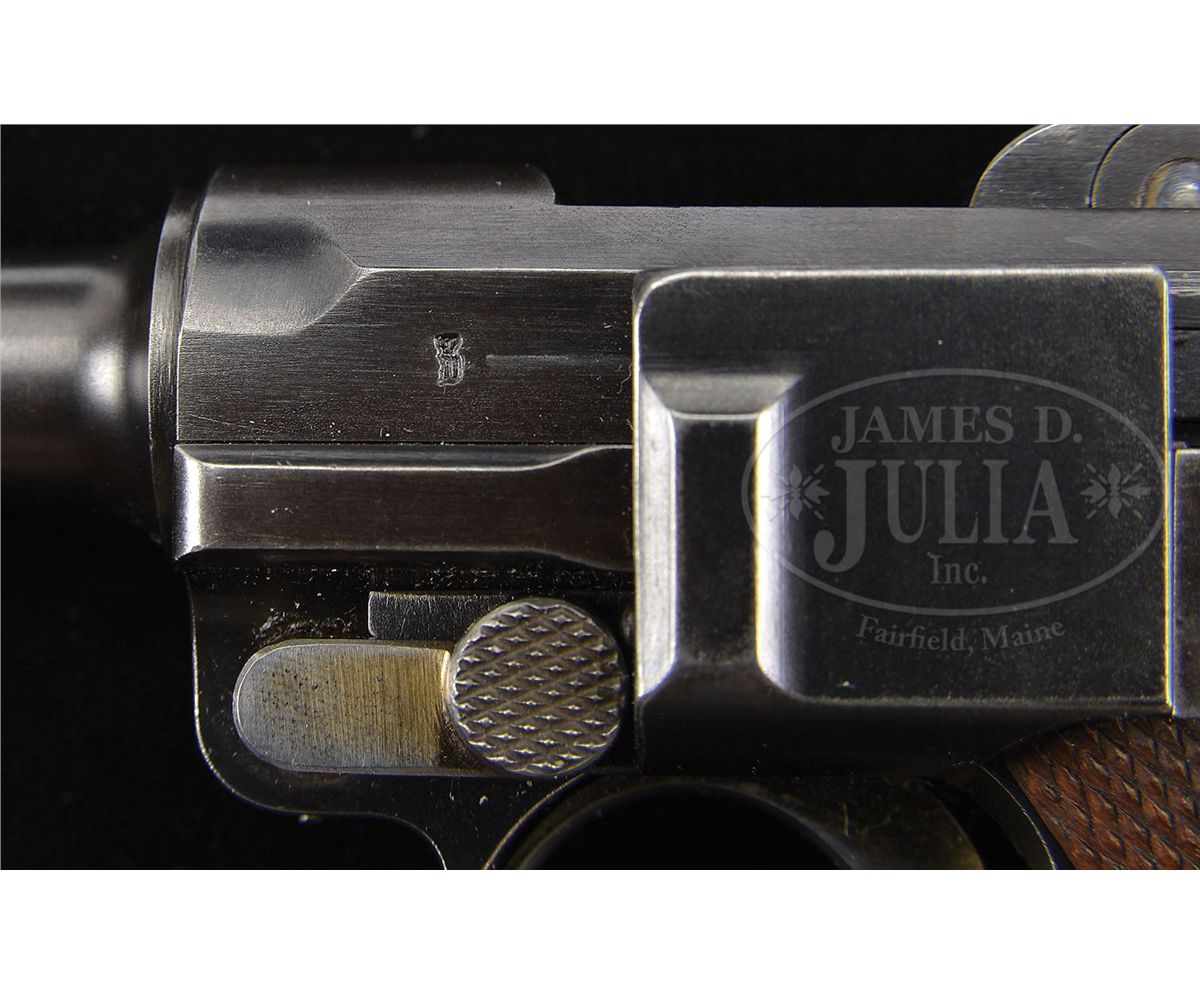 SN 22468. 4" 30 Cal. bbl. Blank chamber and center toggle link. Dished toggles. Grip safety. Short frame and receiver with late internal Old Model machining. Crown/D inspection mark on left side of receiver, this is the highest serial number Dutch trials gun found in the research of the Sturgess book The Borchardt & Luger Automatic Pistols to have this mark, and the only one with higher serial number than the US Powell cartridge counter guns (22400 – 22450)and the late pattern internal machining introduced with the Powell guns. All numbered parts are matching including the checkered walnut grips, which have three digit serial numbers as do the sideplate and the rear toggle link. This gun is featured on pp. 96, 223, 225, 227, 229, 289, 290, 462, 567, and 600 of Dr. Geoffrey Sturgess' book. This is a very rare configuration of calibre, barrel and frame length, only 109 of which were made for Dutch trials and delivered in March/July 1905. PROVENANCE: Collection of Dr. Geoffrey Sturgess. CONDITION: Excellent. Retains 97% orig blue and 90% orig straw. Bore is bright and sharp. Grips are lightly worn and show nice color. Magazine is excellent with a couple of very minor chips on the wood bottom. Mechanics are excellent. 4-52757 BWS84