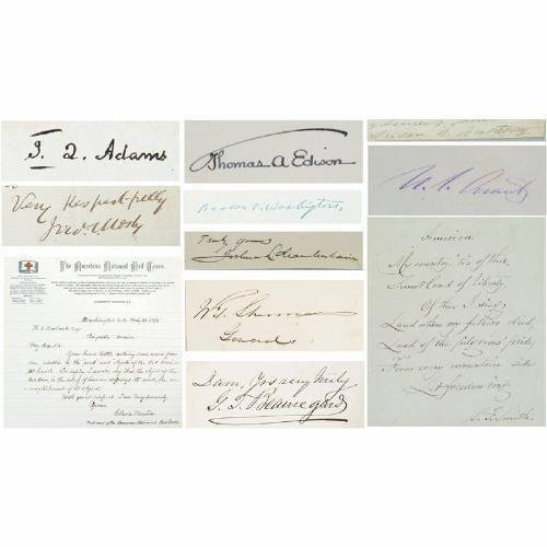 IMPORTANT ESTATE COLLECTION OF 425+ AUTOGRAPHS. The single owner collection was amassed by H. E. Burbank of Augusta, Maine in the 1890s, mostly 1894 and 1895. Most were provided by the signors as a response to his letter request. They were found loose in a small shirt box with evidence that some were previously `mounted in an album. The signors responded in a variety of ways including hand written letters, notes, poems, music or autographs. It is a capsulation of the important figures of the day. Presently the loose pieces have been placed in four albums contained in see through sleeves. An old list was found in the box but is incomplete. We have gone through and identified approximately half of the signatures and by no means have captured all of the important figures. CONDITION: As noted above. There may be some glue marks that show some wear on the paper but generally the collection is in very good condition. 9-25986