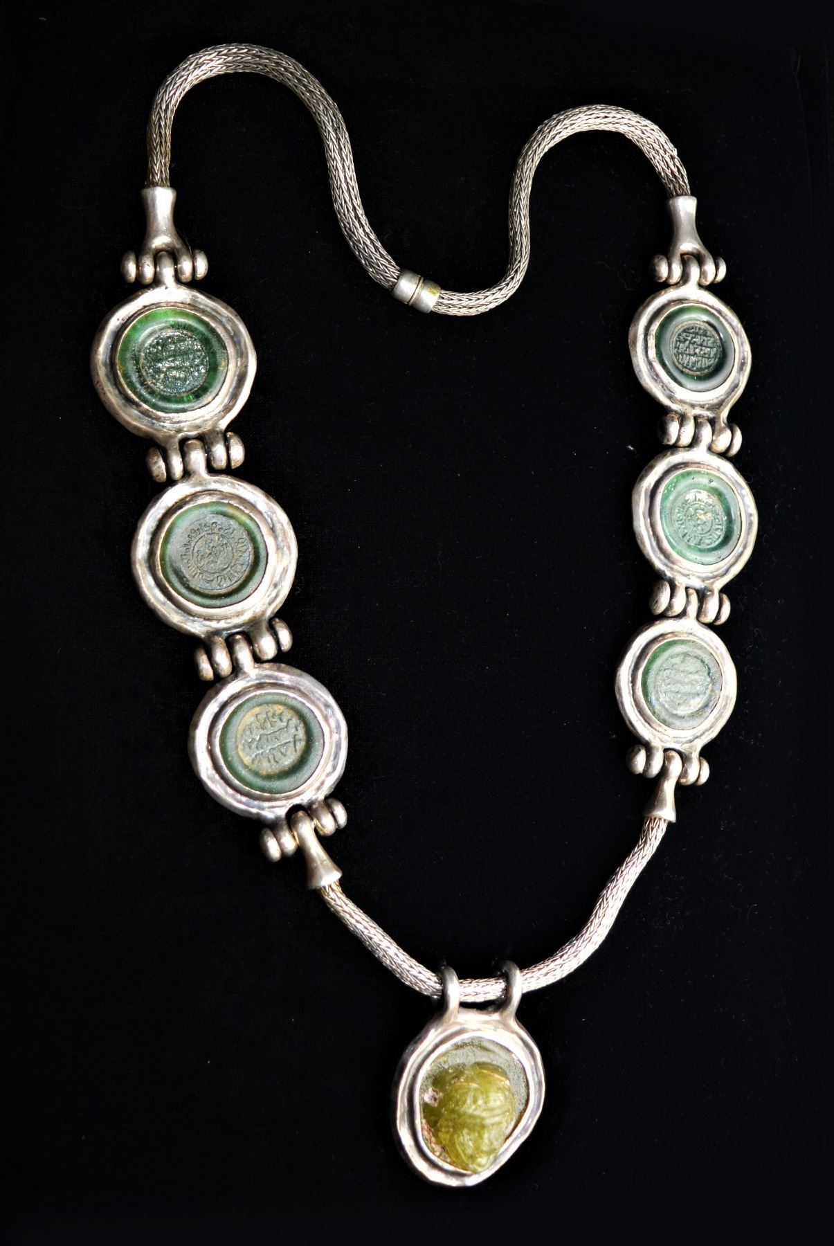 AN EXTREMELY RARE & IMPORTANT ANCIENT ISLAMIC FATIMID INSCRIBED GLASS JETONS SET IN SILVER NECKLACE, EGYPT CIRCA 10TH CENTURY, all six emerald green glass inscribed with names of the caliphs of the fatimid dynasty.with the Caliph's name . which reflect the political and religious authority of the Fatimid Imam-Caliphs. The function of such discs has long been under debate. First seen to be a token of currency, they later, in the mid-19th century, were thought of as coin-weights and by the end of the 19th century a new study suggested that at least some should be viewed as amulets for religious propaganda. For a summary of the debate over their function, see A.H.Morton's article in Contadini, A., Fatimid Art in the Victoria and Albert Museum, 1998, pp.104-08. The earliest weights in this collection date back to the period of Imam al-Muizz, (932-975 CE), the 14th Ismaili Imam and the fourth Imam-Caliph, who founded the city of al-Qahira al-Mu‘izziyya (the Victorious One of al-Mu‘izz), in 969, now Cairo. The city became a major seat of learning with the founding of Al Azhar, illustrating the significance placed by the Imams on scholarship, and who encouraged scholars of all faith persuasions to study and share their knowledge. Including a an important Roman/Greek Glass Camoe with head of a young ruler.