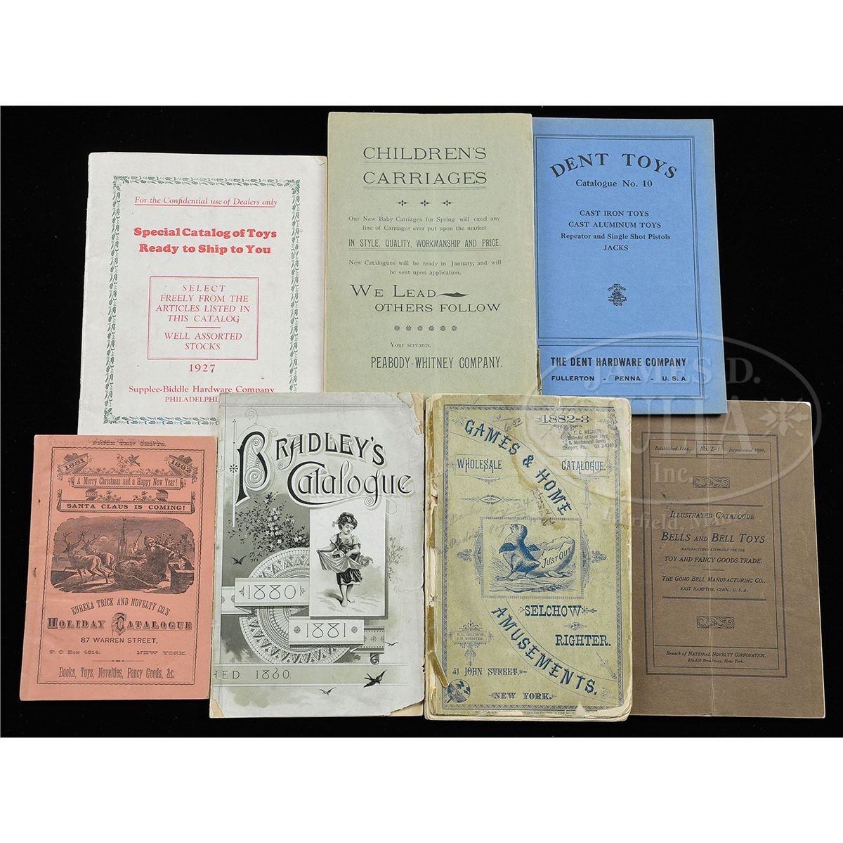 This amazing collection of original 1880s through 1930s catalogs represent cast iron mechanical banks, cap guns, dolls, games, velocipedes, and so many other treasured children's toys. This important lot represents a research library of important toys. This will be an asset to any advanced collector. 1) 1882 Selchow-Righter wholesale catalog featuring board and card games, figural cap guns, novelties, and more. 2) Dent Toys Catalog #10. Late 1920s/early 1930s featuring cast iron toys, pistols, puzzles, etc. Some of the featured toys include the tri-motor Ford airplane, Mack trucks, buses, and cast iron construction toys. 3) The Gong Bell Mfg. Co. circa 1880-1890 catalog showing nearly 60 cast iron figural pull toys. Great stuff! 4) Peabody-Whitney Co. circa 1880-1890 188 page catalog featuring toys, dolls, games, doll carriages, and velocipedes. 5) Eureka Trick & Novelty Co. Holiday Catalog, N.Y. 65 pages. 6) Supplee-Biddle Hardware Co., Philadelphia 1927 catalog showing dolls and carriages, and pressed steel automotive toys. Marx toys, Lionel trains and accessories. 7) Milton Bradley's 1881 catalog featuring paper on wood trains, boats, games, puzzles, and more. 43 pages. SIZE: Largest 10-1/2" l. PROVENANCE: The Diane and late Steve Olin collection. CONDITION: Good to very good. 13271-26
