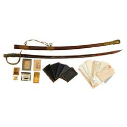IMPORTANT MAINE PRESENTATION CIVIL WAR SWORD WITH HISTORY. 34-3/4" dbl fuller blade marked "SCHUYLER HARTLEY / & GRAHAM / NEW YORK" on the right ricasso and "CLAUBERG / SOLIGEN" on the left. Iron proof on the spine. The blade has short etched panels in the center with an eagle on the right side and US on the left. The iron scabbard has brass fittings. The top one is engraved in script "Presented to - / Lt. Wm H. Moody / Co. L. 2d Maine Cav.Vet.Vols / by the Members of / the Company". Also accompanying the lot are a CDV of him holding the sword and other images of him at various ages. There are also a 2nd Maine Cavalry badge in original box, a metal Colonial's insignia, and a ribbon hanger with a attached eagle above the word "Maine" which was probably from a reunion. There is also a 28-1/2" x 18-1/2" oil on canvas painting or sign for the Recruiting Office of the 2nd Maine Cavalry. There is also the printed roster of that unit with Moody shown in the center. Among the other items included are his yearly diaries during his service in the Civil War starting with Camp Abraham Lincoln at Portland in 1862 when he was with the 27th Maine infantry. This one has locket pictures of Moody and his wife, Abbie, glued inside the front cover and includes orders, movements and various happenings. The diary for 1863 is missing but 1864 covers movements mostly at the recruiting office in Kennebunk where there are numerous "at home" listings. Was wounded at the Battle of Port Washington at the end of September "had the bullet cut from my leg today. Made application for a furlough" on October 6th. On the 8th he marched his troop on orders of Captain Lincoln. On the 9th "my wound is worse accounting to the exercise I took yesterday". In the 1865, on April 10th it is reported that "Richmond is taken". On the 14th "went to Braggs Bridge. The President was assassinated by J Wilks Booth at Fords Theater Washington D.C." evidently from a newspaper report. Most of the time after this was spent in parade and guard duty. On December 6th "was mustered out of service today". 1866 is mostly occupied by office and business returns around Pensacola. Another book is undated but lists most of the men in the regiment with various payments and duties. A stack of letters, commissions, and reunion notices, and awards, including his appointment as a delegate to the Farmer's National Congress signed by the Governor of Maine. This includes a lengthy exchange with the Pension Bureau over the value of his wounds. A newspaper article in the New York Tribune for July 6, 1863 mentions that Moody's regiment had volunteered to stay in service in Washington D.C. beyond their enlistment time. CONDITION: Blade is bright with scattered surface rust. Brass is very dark but shows little wear. Metal scabbard has considerable surface rust. Recruiting sign has minor crackling. Framed roster has toning but has no spots or cracks. Regimental badge is like new. Books and letters are all in fine condition. 4-53431 FS515