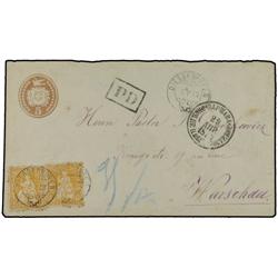1873 DEISSENHOFEN a WARSAW (Polonia). Entero Postal de 10 rp. rojo con franqueo complementario de 10 rp. y 25 rp. Muy rara destinación para una...