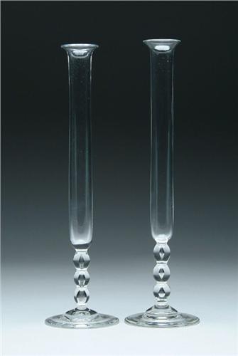 IMPORTANT STEUBEN BUD VASES. This very important pair of tall bud vases is early Sidney Waugh/Frederic Carder design of 1934. The tall slender vases with controlled bubble stems are signed on the underside in script "Steuben". Pictured on pg. 324 of the new Madigan book "Steuben Glass: An American Tradition in Crystal". SIZE: 11-3/4 in. t. CONDITION: Very good to excellent. 5-61157