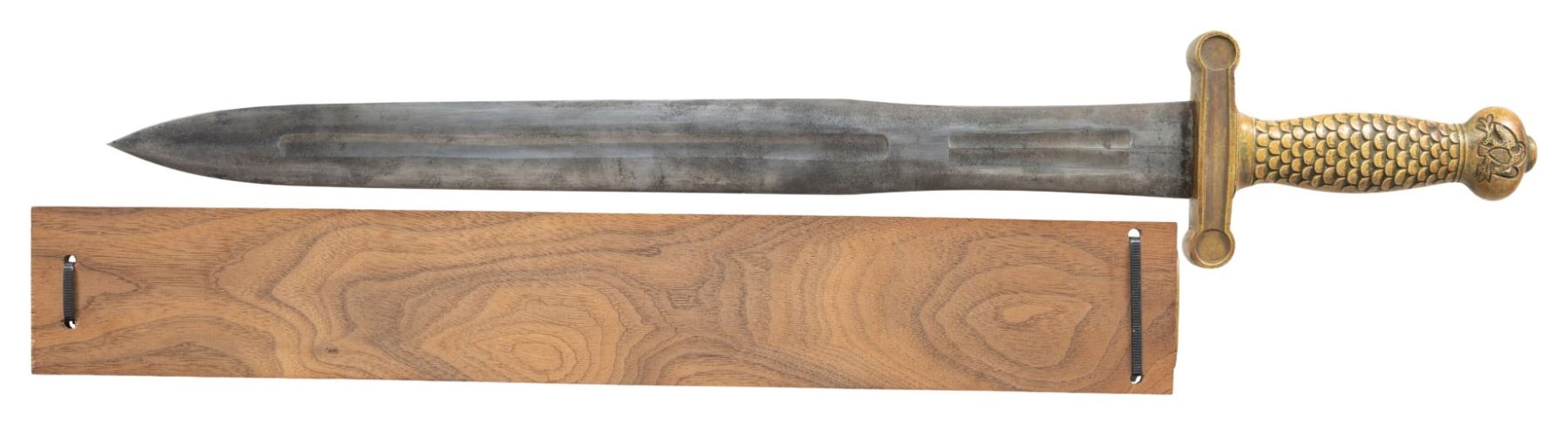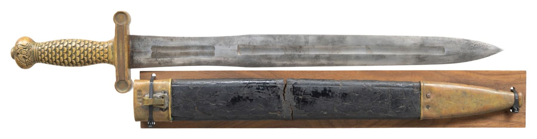 A good example of an imported M1832 Artillery short sword lacking the 3 iron rivets in the handle. The fuller grind on the blade is similar to an Ames blade but not as crisp or even. Overall length 25" with a 19" blade. Brass hilt. Leather scabbard is retained to wooden board for support with "8527" stamped on throat. CONDITION: sword scabbard held in place by zip ties as leather scabbard is in 2 pieces with cracking & tearing leather. Brass shows mustard patina & numerous handling marks. Visible portions of blade has gray patina appearance. PROVENANCE: Estate Collection of Nicholas Apergis. (02-24665/MD). NON-GUN. $500-800.