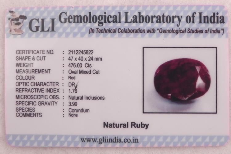 IMPPRESSIVE RARE 476 CT MUSEUM SIZE CERTIFIED RED RUBY OVAL CUT NATURAL OPAQUE PLEASE SEE CERTIFICATION FOR FURTHER DETAILS