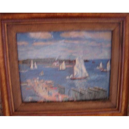 Beautiful Print of Sailboats in the water and at dock which reminds me of Annapolis the Capitol of Maryland and Home of the U.S.NAVAL ACADEMY. Pitcured in this picture are people in a very impressionist style and appears to be dated from the mid 1900's. The frame probably also dates from the Mid 20TH Century. There is a house on the island in the middle of the body of water. Bright Blue Sky with touches of purple and pink. Green trees and Orange boats on a Dark Blue Water. This piece of art work measures 8" X 10" and is framed and mounted in glass with a nice ornate frame decorated with carved leaves and ribbed edging. Very Decorative. The frame is painted in gold and green and is 15" X 13" X 1 1/2". The print is in perfect condition and ready to hang on the wall.