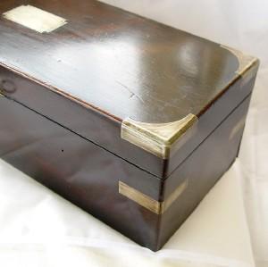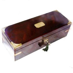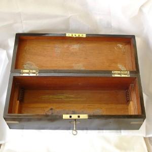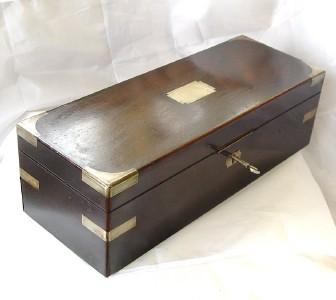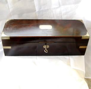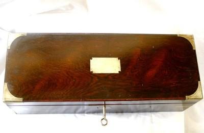 IMPRESSIVE ANTIQUE INSTRUMENT BOX ROSEWOOD with KEY c1800, A long instrument box made of thick rosewood veneer with a brass shaped cartouche and escutcheon, dating it to the earlier part of the 19th century. Dimensions 14 1/2 x 5 1/2 x 4 1/2