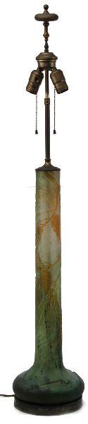 Light green glass with amber pine limb and pine cone motif in cameo. Signed "galle" in cameo. Vase height is 23 inches with overall height of 40 inches including finial. Adjustable shaft. Double socket with individual pull chains. Shade is absent. Needs r