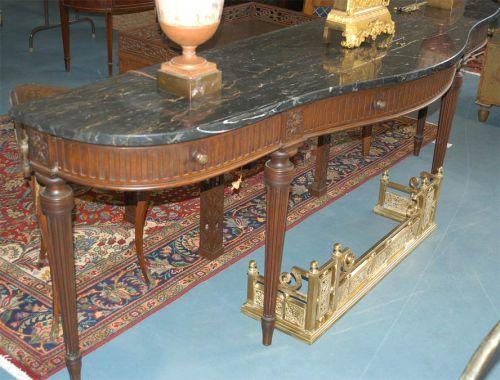 IMPRESSIVE FRENCH STYLE MARBLE TOP CONSOLE with swing drawers and fluted legs, black vein marble with repair,8'6" long 24" deep, 36" high,circa 1920, SHIPPING: See recommended third party shippers. This item can't be packed or shipped by seller and must