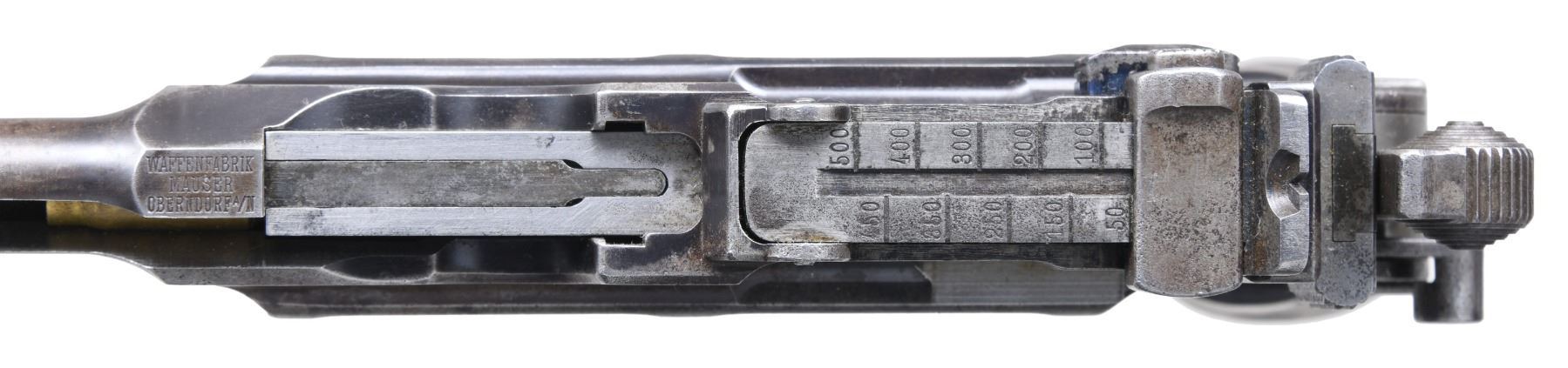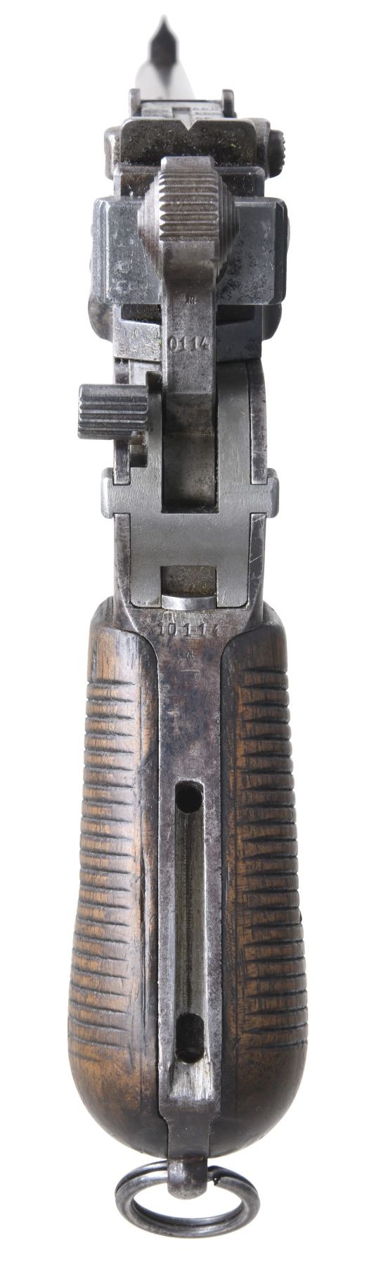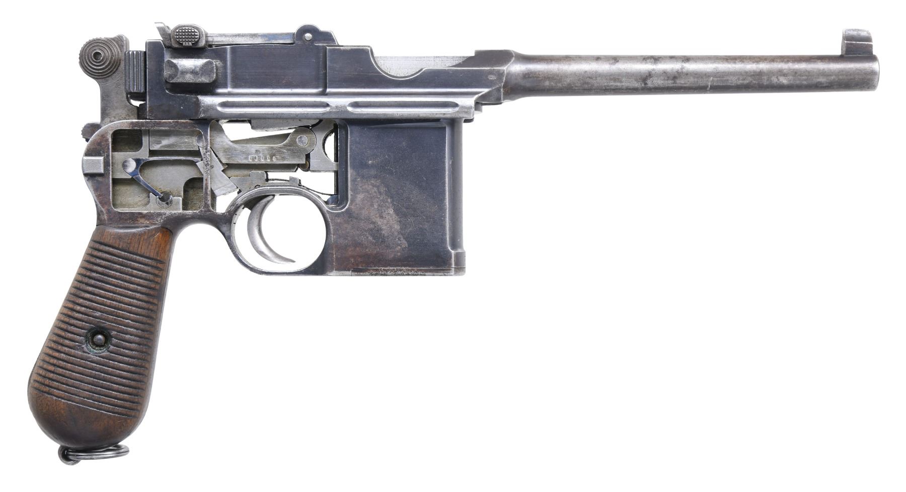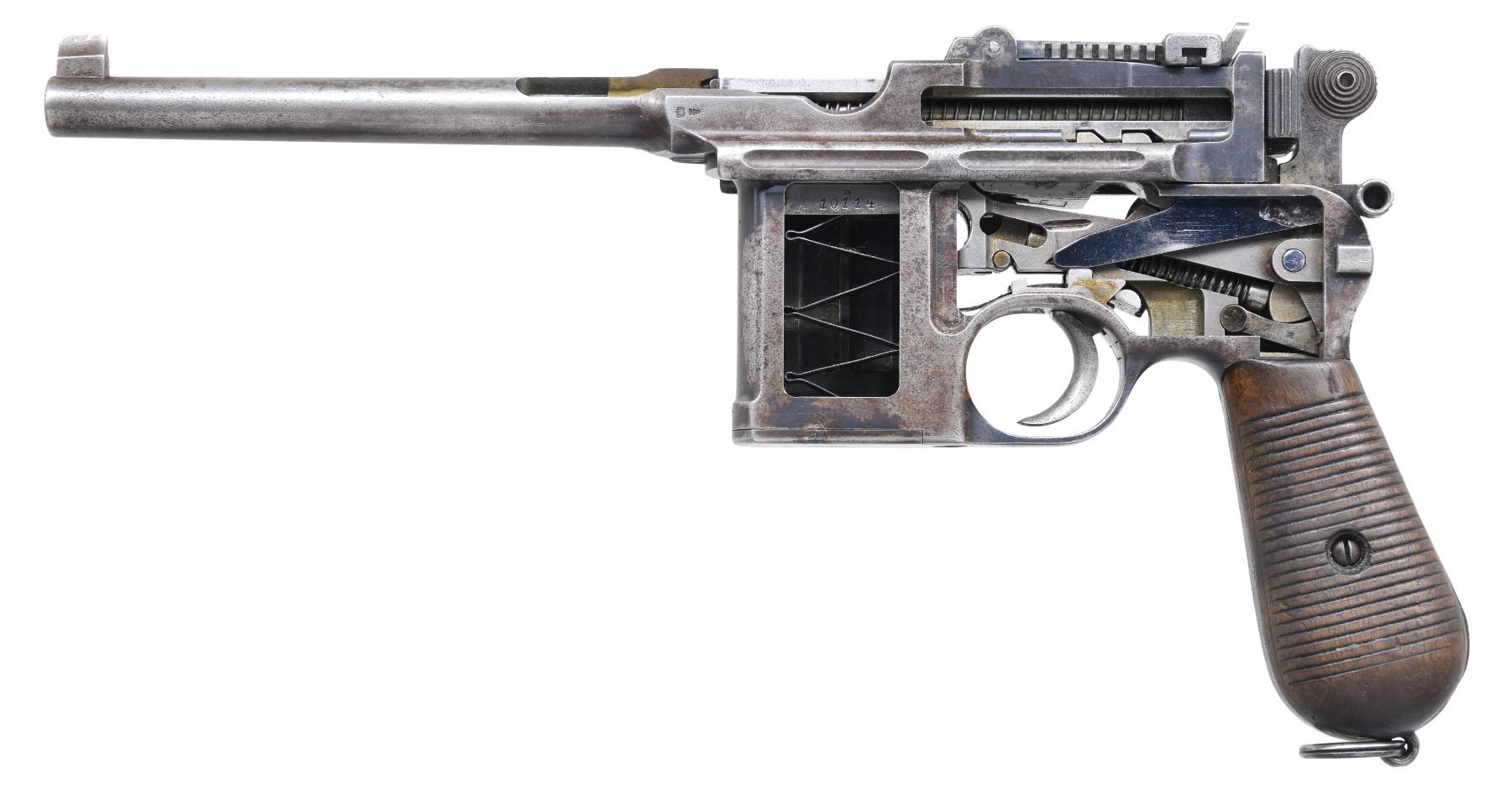 Cal. 7.63mm. S# 10114. Bbl. 5 1/2". Standard late production Conehammer with a 5.5" bbl., fixed front sight, and pinned rear sight graduated 50-500. Long extractor, independently secured firing pin, and early safety. Top of chamber with usual 3-line address: Crown/"C"/"U" on left side of bbl. extension; antler proof on right side. Major components are rust-blued with the usual fire-blued small parts. The bolt, hammer, and trigger assembly are in-the-white. Extensive disassembly shows an all-matching gun, save for the firing pin, which is stuck and cannot be checked. Serrated wood grips are each matched to the pistol. A lanyard ring is present. Extensively cutaway under the documented direction of noted Mauser collector/specialist Joseph J. Schroeder, author of System Mauser. Cutaway is closely modeled after pictured examples with windows in the chamber area to show bolt/firing pin assembly, follower/follower spring, and virtually all the functioning components on either side of the frame. CONDITION: good original finish, with most of the surface on the left side toned or faded to a brownish gray. Most remain rusty blue on the right side of the frame and lower surfaces. Comparable-condition grips that are dark with slightly flattened serrations and numerous light handling marks. Bore is dark, with barely discernible rifling. Proper manual mechanics. A wonderful opportunity to get an impressively cutaway Conehammer, whose was explicitly performed under the direction of Joseph J. Schroeder. PROVENANCE: Ex-Collection of Curtis H. Halvorson. (01-25855/LMA). ANTIQUE. $2,500-4,500.