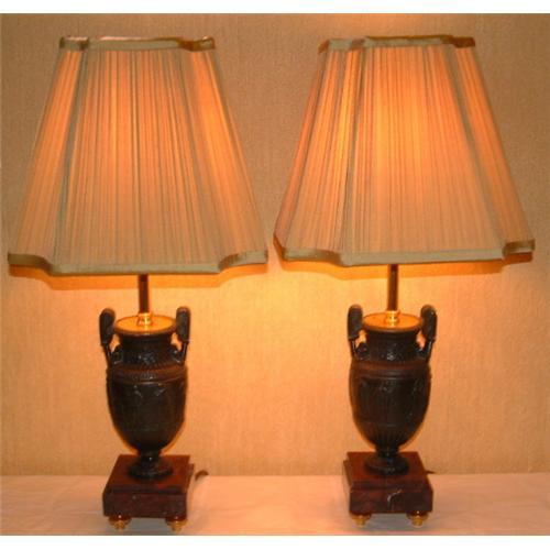 Exquisite Pair French Bronze and Marble Urns now converted to Electric Table Lamps complete with hand made silk shades. The main bodies of solid bronze depicting the Townly Vase raised on square well veined marble bases of reddish brown colour, each on four ormolu feet, late 19th Century. <p> In overall perfect untouched condition, with no losses or damage These Lamps are unmarked. <P> Dimensions Height: (entire as shown with shades) 20.75? (52cm). Width: (of shades) 10" (25.5cm).