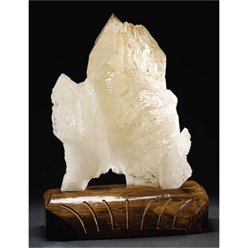 <B>IMPRESSIVE QUARTZ CRYSTAL GROWTH</B></I><BR> <I>Brazil</B></I><BR>A spectacular example of natural quartz crystal growth, this imposing piece stands 31 inches high and sits upright on a custom wooden display stand, with a naturally-formed arch at the base. The exterior is craggy and faceted, like an ancient mountain peak, but the cloudiness near the bottom slowly thins out to a sublime clarity in the multiple peaks, allowing the light to penetrate into and refract off the interlocking planes of crystal growth within. The addition of a backlight will bring the whole natural sculpture to ecstatic life, seemingly aglow with an inner fire that runs in every direction. <BR><BR><b>Shipping:</b> Requires 3rd Party Shipping (<a target="_blank" href="http://www.heritageauctions.com/common/shipping.php">view shipping information</a>)