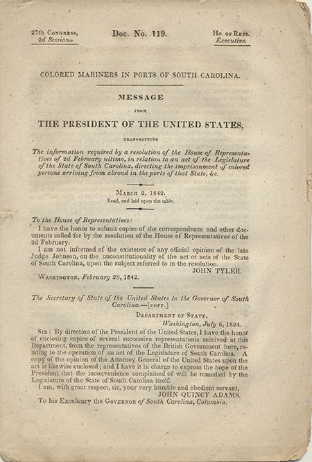 Printed pamphlet titled: "Colored Mariners in Ports of South Carolina: Message from the President of the United States Transmitting the information required by a resolution of the House of Representatives of 2d February Ultimo, in relation to an act of the Legislature of the State of South Carolina, directing the imprisonment of colored persons arriving from abroad in the ports of that State...", 18pp. Mar. 2, 1842. This notice, of course, called for the imprisonment of newly-arrived slaves, who ironically played a huge role in the Atlantic trade of the time. The pamphlet contains the text of letters from politicians such as John Quincy Adams, William Ogilby and others. May be incomplete, very good condition.