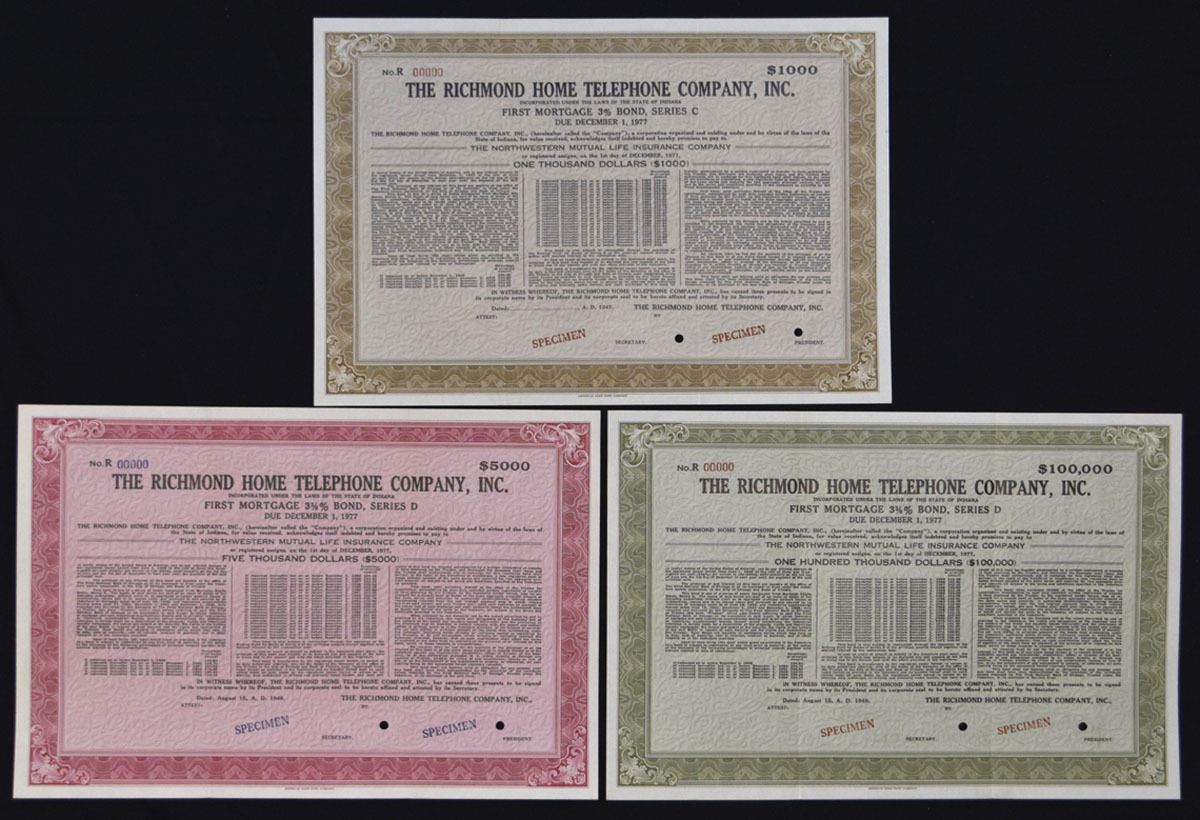 Indiana. 3 pieces: $1000 Specimen 3% First Mortgage Bond in brown; $5000 Specimen 3 3/8% First Mortgage Bond in red; $100,000 Specimen 3 3/8% First Mortgage Bond in green.
