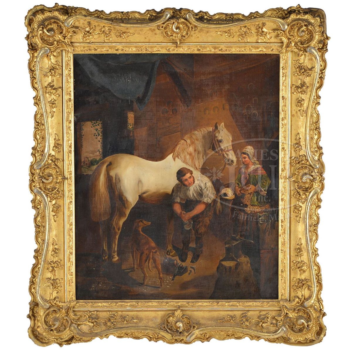 Oil on canvas Housed in a fine 19th century gesso decorated frame with some gilt loss, having a Sherk Brothers Brooklyn label on verso Unsigned SIZE: 30" x 25". Overall: 41" x 35-1/2" CONDITION: Very good, minor chips to left edge and and upper left 9-29626