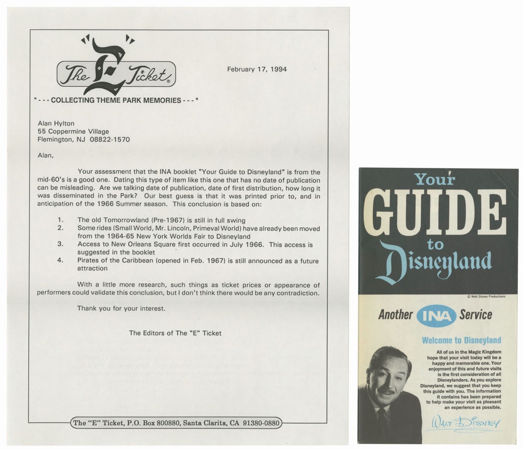 (Disneyland, c.1960s) A complete guide to Disneyland from the 1960s, as well as a letter from the editors of "The 'E' Ticket" newsletter. Created by INA (Insurance by North America), this 33-page guidebook includes maps, attraction summaries, and general information about the park. The guidebook measures 7"x4" and the items are in very good condition with some creasing to the guidebook, as well as fold lines to the letter.
