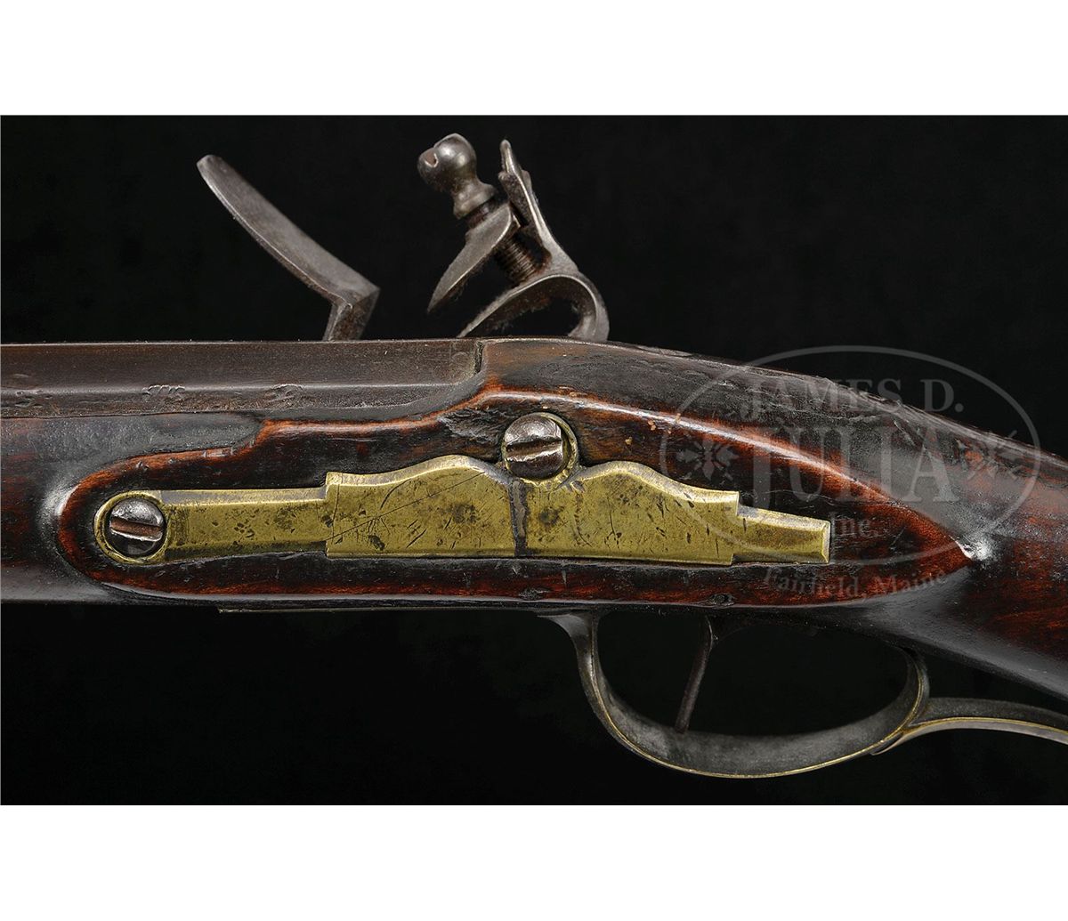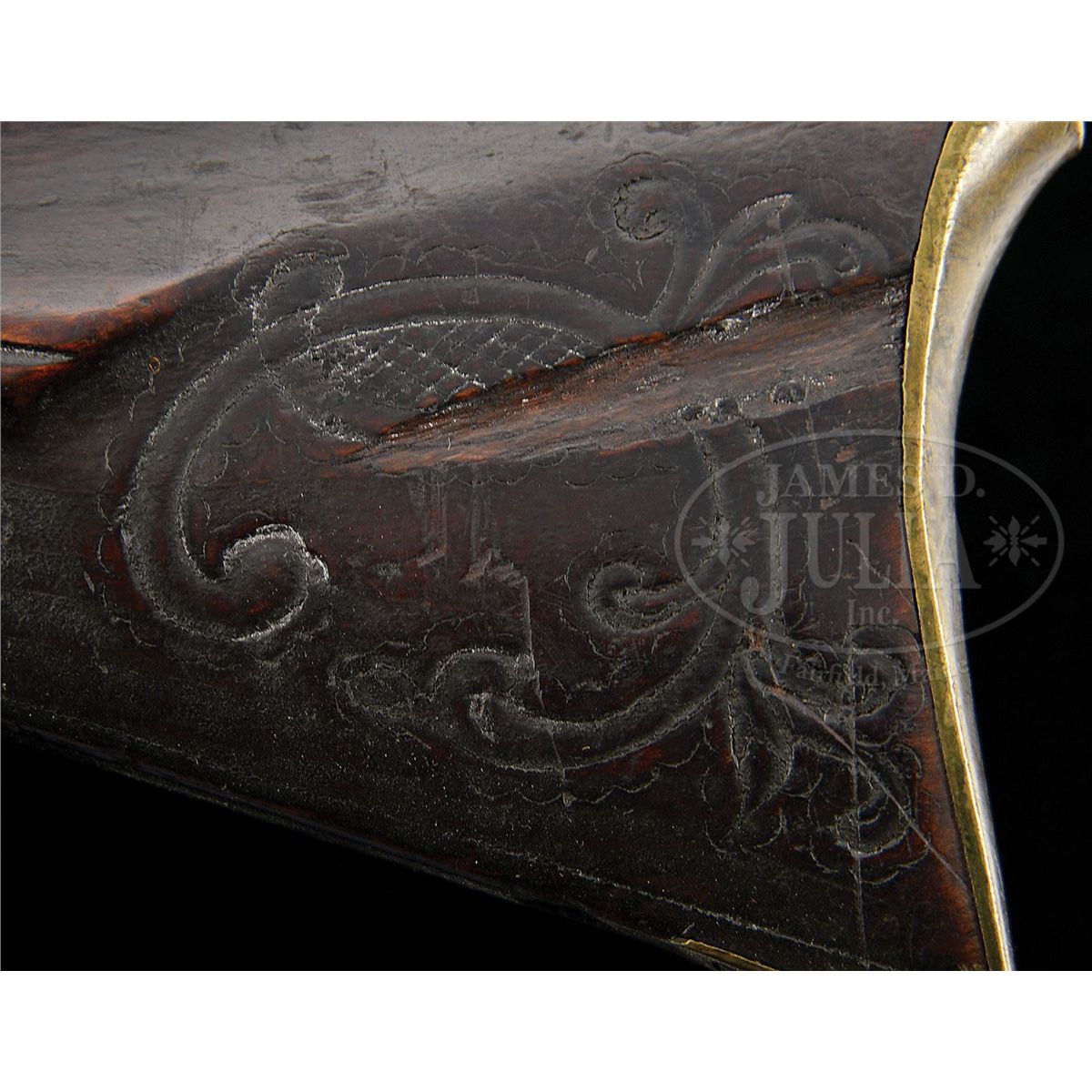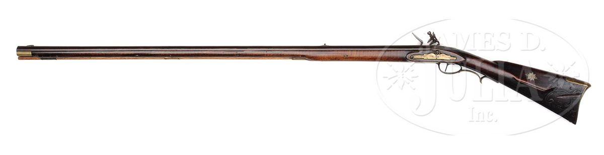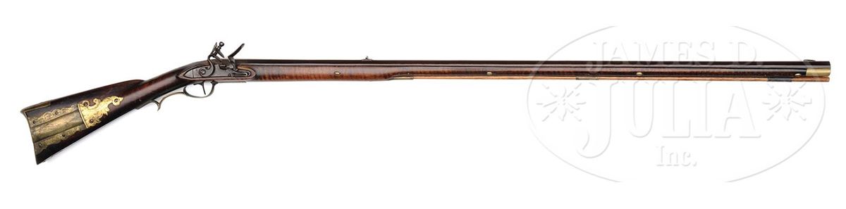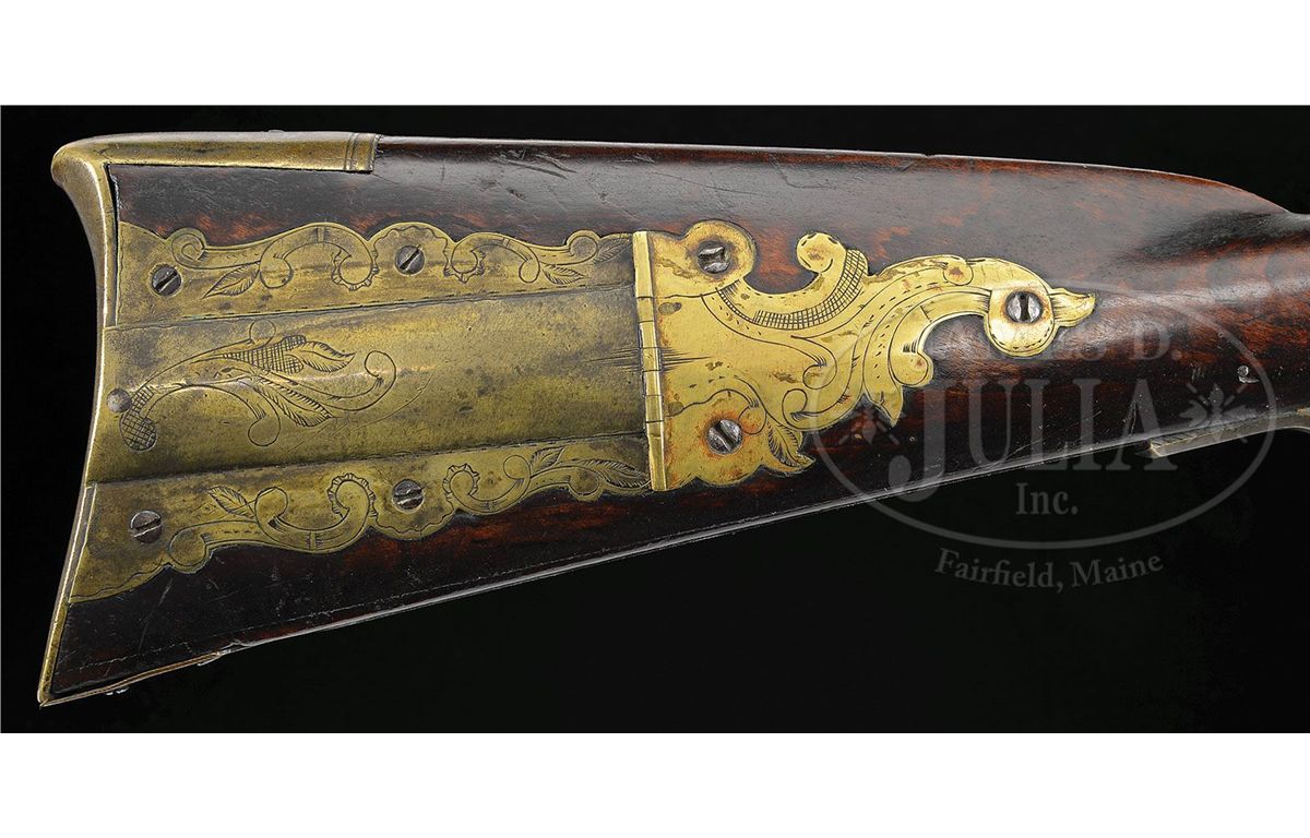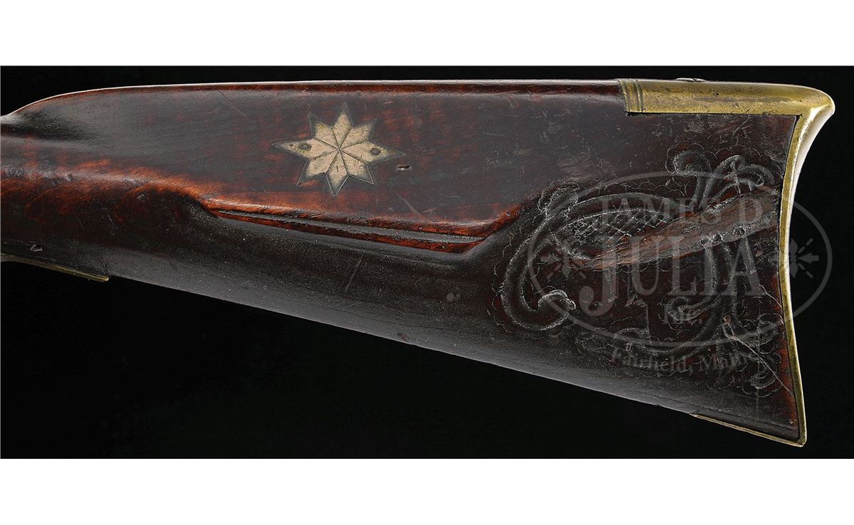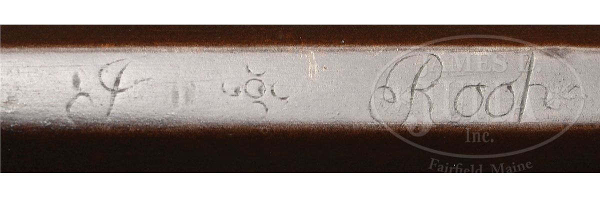 NSN. Cal. .54 rifled. This rifle has a 42 ¾ inch full oct barrel signed “J. Roop”. Roop is said to have worked in Dauphin Co Pennsylvania. The rifle has a hand forged lock and a four piece engraved brass patch box. The curly maple stock is incised carved on the cheek side of the butt and behind the barrel tang. The side plate is heavy beveled brass and a small silver eight pointed star is used as a cheek piece inlay PROVENANCE: Collection of Woody Frey. CONDITION: Good to very good. Toe plate has been replaced and there is a 2” by 3/8“ gouge through the incised carving in the butt.ÊÊThere is an 8" wood sliver repair on the right hand side of the fore stock at the muzzle and a number of small wood repairs in the forend. 4-48489 RG7