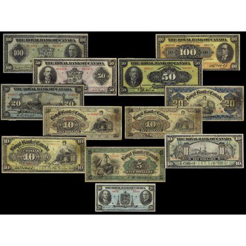 INCLUDES 36 NOTES: Issues of 1901: $5 1901 630-10-02-02 ,brown and $5 1901 630-0-02-04 Green tint, $10 1901 630-10-02-06 engraved and $10 1901 630-10-02-08 typed. Issues of 1909: $5 1901 630-10-04-02 Black, Holt right and $5 1909 CH-630-10-04-06 Green Holt left, 1909 $10 630-10-04-10 Multicolour, olt right $20 1909 630-10-04-22 Blue, Holt. Issues of 1913: $5 1913 630-12-02 Miss. signatures and $5 1913 630-12-04 Typed Neil , $10 1913 630-12-06 Miss. Sign. and 630-12-08 Typed Neil, $20 1913 630-12-12 Typed Neil, $50 1913 630-12-16 Miss. sign. 630-12-18 Typed Neil 630-12-16P Face and Back, $100 1913 630-12-20 Miss Sign. 630-12-12 Typed, 630-12-20P face and back. Issues of 1927: $5 1927 630-14-04 Wilson, $10 1927 630-14-06 Neil, 630-14-08 Wilson, $20 1927 630-14-10 Neil, 630-14-12 wilson $50 1927 630-14-16 Wilson, $100 1927 630-14-18 Neil, 630-14-20 Wilson. Issues of 1933 $5 1933 630-16-02 $10 1933 630-16-04. Issues of 1935: $5 1935 630-18-02, 630-12a, $10 1935 630-18-04 and 630-18-04a, $20 1935 630-18-06 and 630-18-06a. Issues of 1943, 1943 $5 630-20-02.Grades vary from VG+ to Choice Uncirculated.