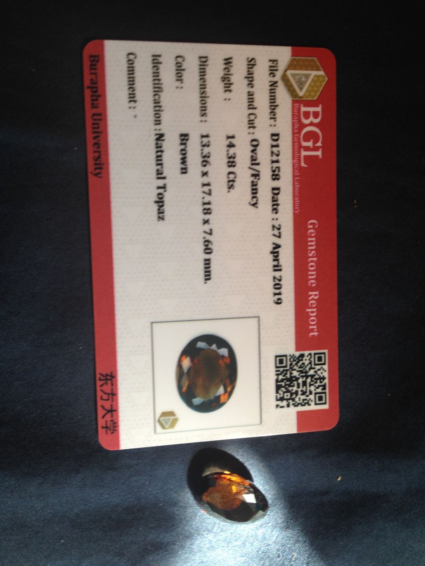 INCREDIBLE 14.38 CT CERTIFIED IMPERIAL TOPAZ SOLITARE. 100 % NATURAL UNHEATED AND UNTREATED DISPLAYING AN AMAZING DEEP AMBER PINKISH BROWN HUE AND EVEN SATURATION. NEAR FLAWLESS OVAL CUT MEASURING 13.36 x 17.18 x 7.60 mm. PLEASE SEE CERTIFICATION FOR FURTHER DETAILS. READY TO MOUNT. Imperial Topaz, with its distinct peach, pink, orange or champagne hues, is the rarest topaz variety. The primary source is the Ouro Preto mines of Minas Gerais, Brazil. Desposits were also found in the Urual Mountains in Russia.