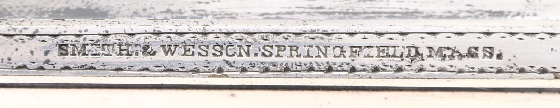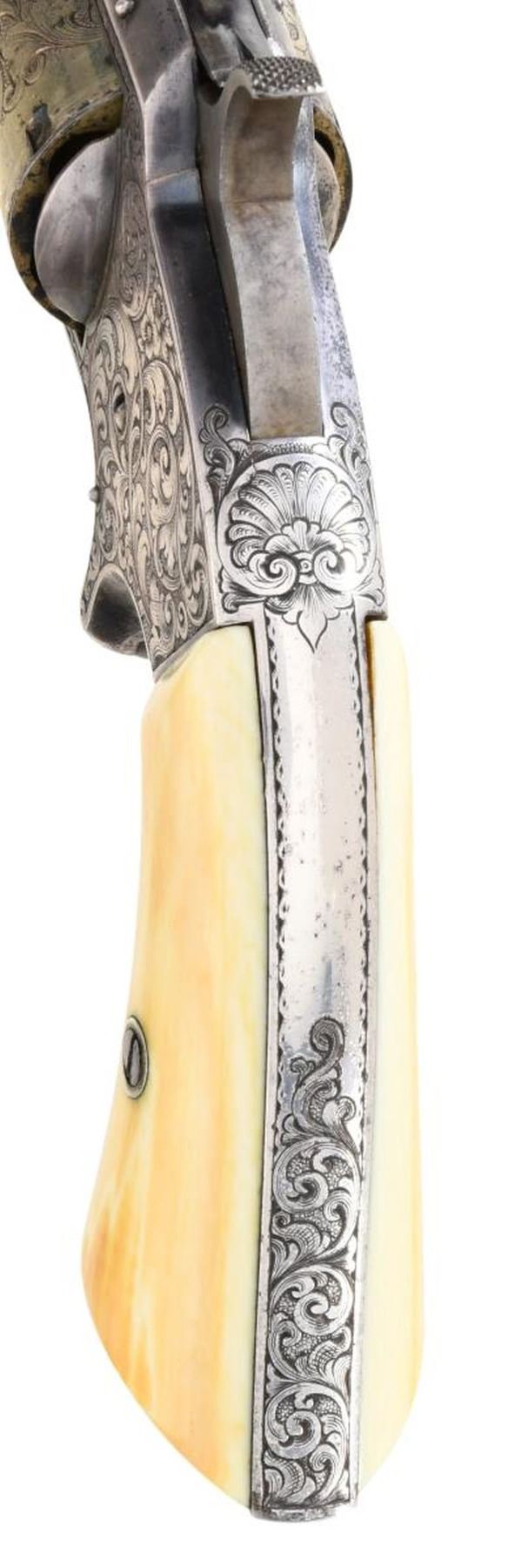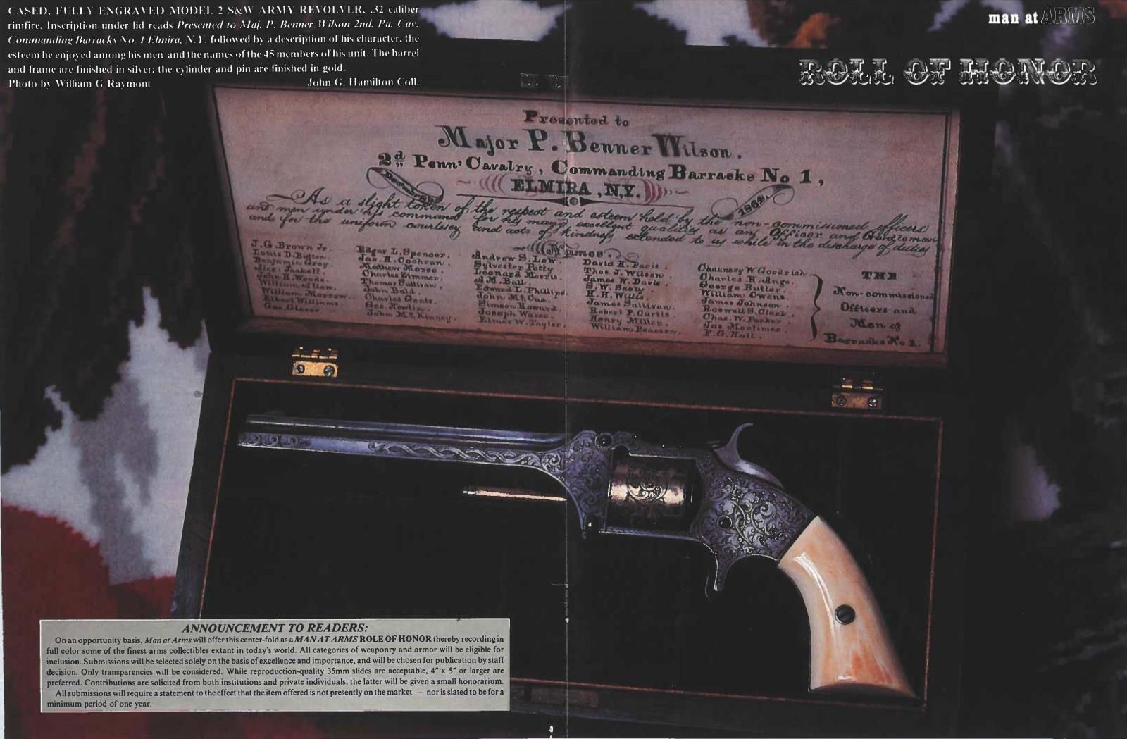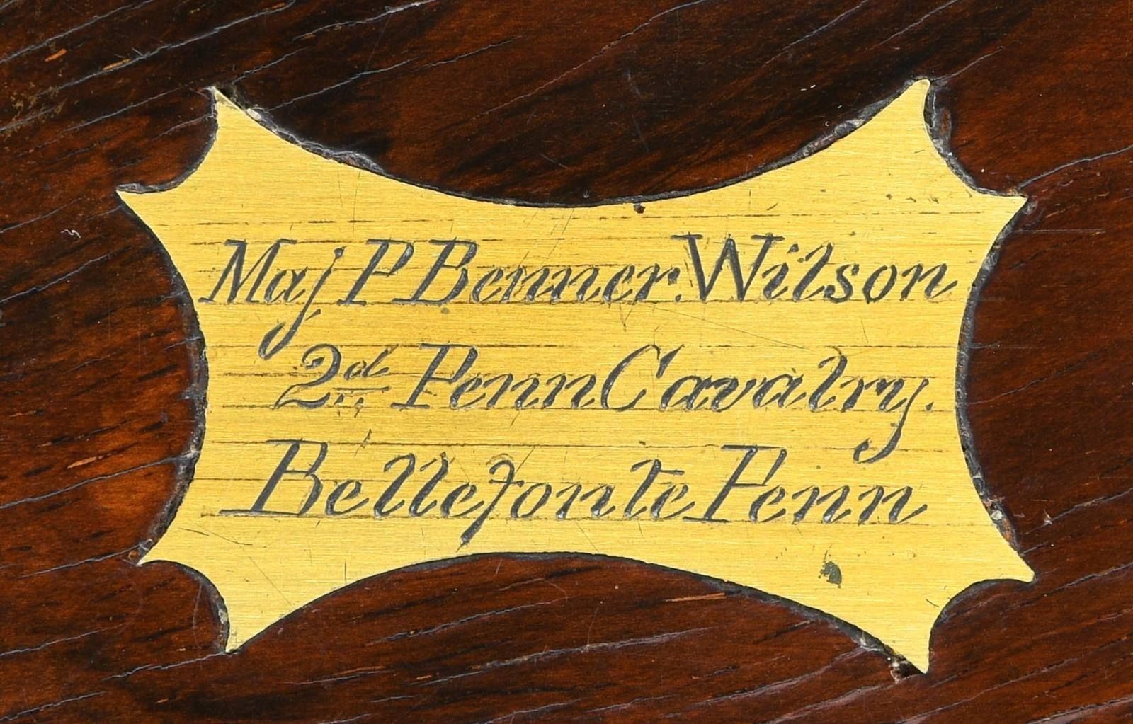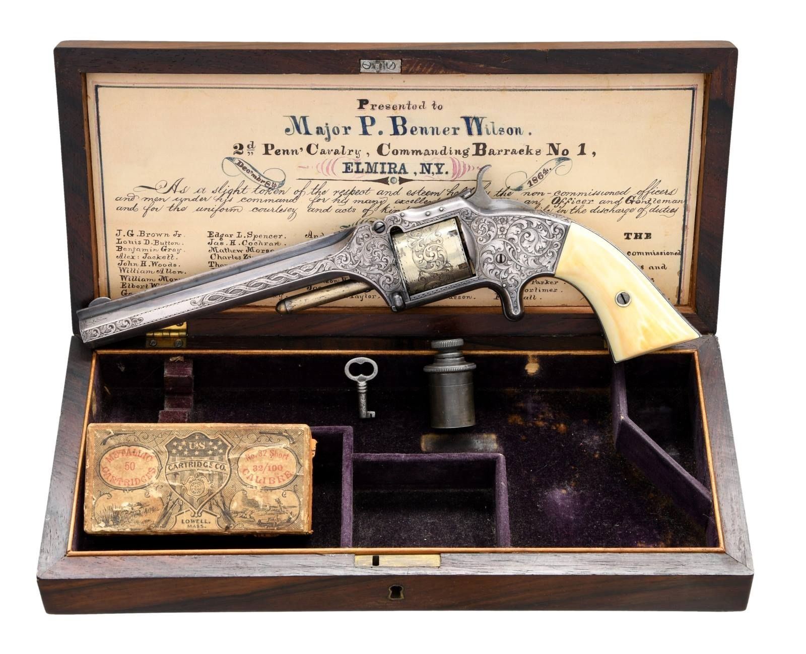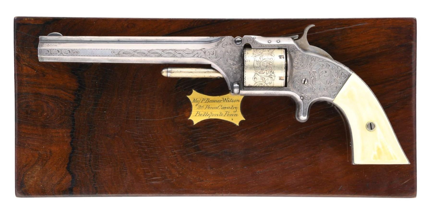 SMITH & WESSON ARMY REVOLVER, CAPT. P.B. WILSON, 2ND PA CAV, ELMIRA, NY. Cal. 32RF. S# 25202. Maj. Wison commanding Barracks No. 1 at Elmira, NY must have been well loved by the 45 noncoms and officers under his command. This beautiful, engraved silver and gold plated Smith & Wesson army revolver was presented December 8th, 1864 as seen by the beautiful polychrome calligraphy 11" x 4.5" presentation inside top lid of mahogany casing. Revolver is housed in a royal purple lined mahogany casing with engraved plaque in the lid "Major P. Benner Wilson / 2nd Penn Cavalry / Bellefonte Penn". You will not find a better Civil War presentation Smith & Wesson revolver. Philip Benner Wilson (1822-1871) mustered into service as a 39 year old captain, January 16, 1862 of 2nd Ohio Cavalry, he was promoted to major in May, 1863. He became too ill for active field service, in October 1864 was given command of Barracks No. 1 at Elmira, New York barracks which sat on high ground above the Elmira prison camp. It housed recruits, veteran volunteers, and prison guards. At this time there were over 20,000 prisoners at barracks No. 3. By March 1865, Major Wilson was commanding officer at Elmira prison camp. He would stay until August 8, 1865, go home and muster out. CONDITION: excellent overall, revolver retains virtually all its original silver and most of its original thinning gold. Fine well fit original ivory grips have fine mellow patina. Revolver was not taken apart but inside box there is a note stating "gun cleaned Feb 7, 1937 with name & Bellefonte, PA. Mechanically fine, bright crisp bore. Casing is fine, most original varnish with crazing. PROVENANCE: John G. Hamilton collection; pictured as "Roll of Honor" firearm in "Man at Arms" May-June 1988; from the Lifelong Collection of Robert "Mike" Bricker. (01-25066/JS). ANTIQUE. $10,000-20,000.