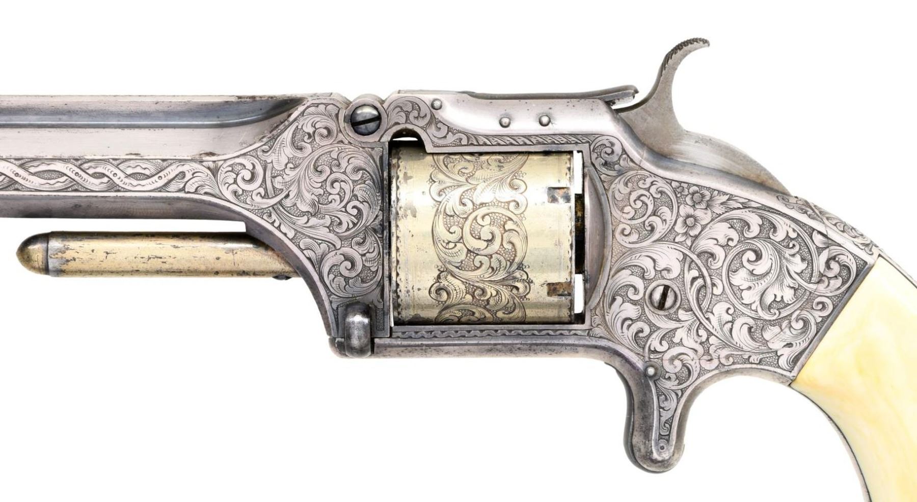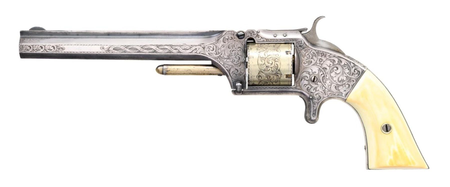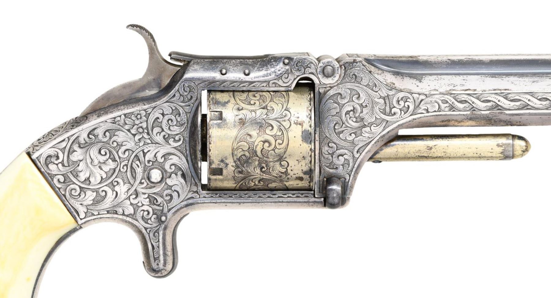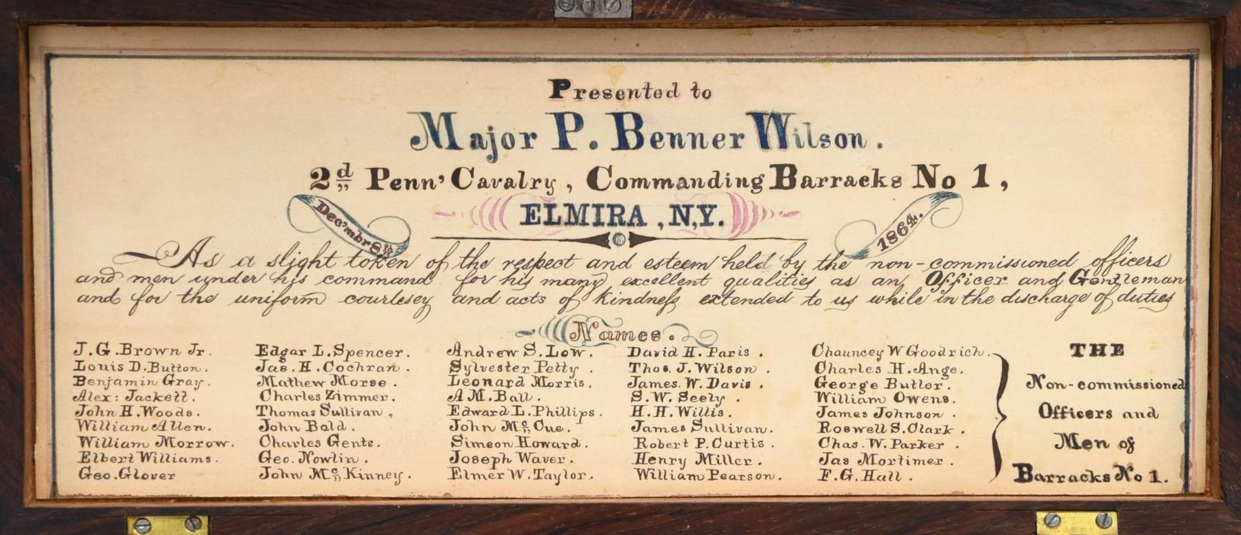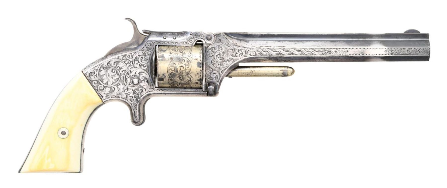 SMITH & WESSON ARMY REVOLVER, CAPT. P.B. WILSON, 2ND PA CAV, ELMIRA, NY. Cal. 32RF. S# 25202. Maj. Wison commanding Barracks No. 1 at Elmira, NY must have been well loved by the 45 noncoms and officers under his command. This beautiful, engraved silver and gold plated Smith & Wesson army revolver was presented December 8th, 1864 as seen by the beautiful polychrome calligraphy 11" x 4.5" presentation inside top lid of mahogany casing. Revolver is housed in a royal purple lined mahogany casing with engraved plaque in the lid "Major P. Benner Wilson / 2nd Penn Cavalry / Bellefonte Penn". You will not find a better Civil War presentation Smith & Wesson revolver. Philip Benner Wilson (1822-1871) mustered into service as a 39 year old captain, January 16, 1862 of 2nd Ohio Cavalry, he was promoted to major in May, 1863. He became too ill for active field service, in October 1864 was given command of Barracks No. 1 at Elmira, New York barracks which sat on high ground above the Elmira prison camp. It housed recruits, veteran volunteers, and prison guards. At this time there were over 20,000 prisoners at barracks No. 3. By March 1865, Major Wilson was commanding officer at Elmira prison camp. He would stay until August 8, 1865, go home and muster out. CONDITION: excellent overall, revolver retains virtually all its original silver and most of its original thinning gold. Fine well fit original ivory grips have fine mellow patina. Revolver was not taken apart but inside box there is a note stating "gun cleaned Feb 7, 1937 with name & Bellefonte, PA. Mechanically fine, bright crisp bore. Casing is fine, most original varnish with crazing. PROVENANCE: John G. Hamilton collection; pictured as "Roll of Honor" firearm in "Man at Arms" May-June 1988; from the Lifelong Collection of Robert "Mike" Bricker. (01-25066/JS). ANTIQUE. $10,000-20,000.