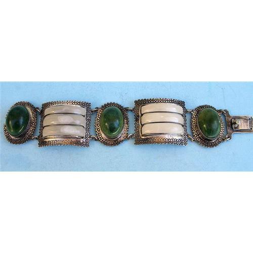 Very very cool chunky bracelet with Onyx and polished Calcite cabochons set in sterling well worked bracelet. Looks extremely cool on and is 10 times better in person. If you need one cool bracelet this is it. Circa 1930. Condition is very good.