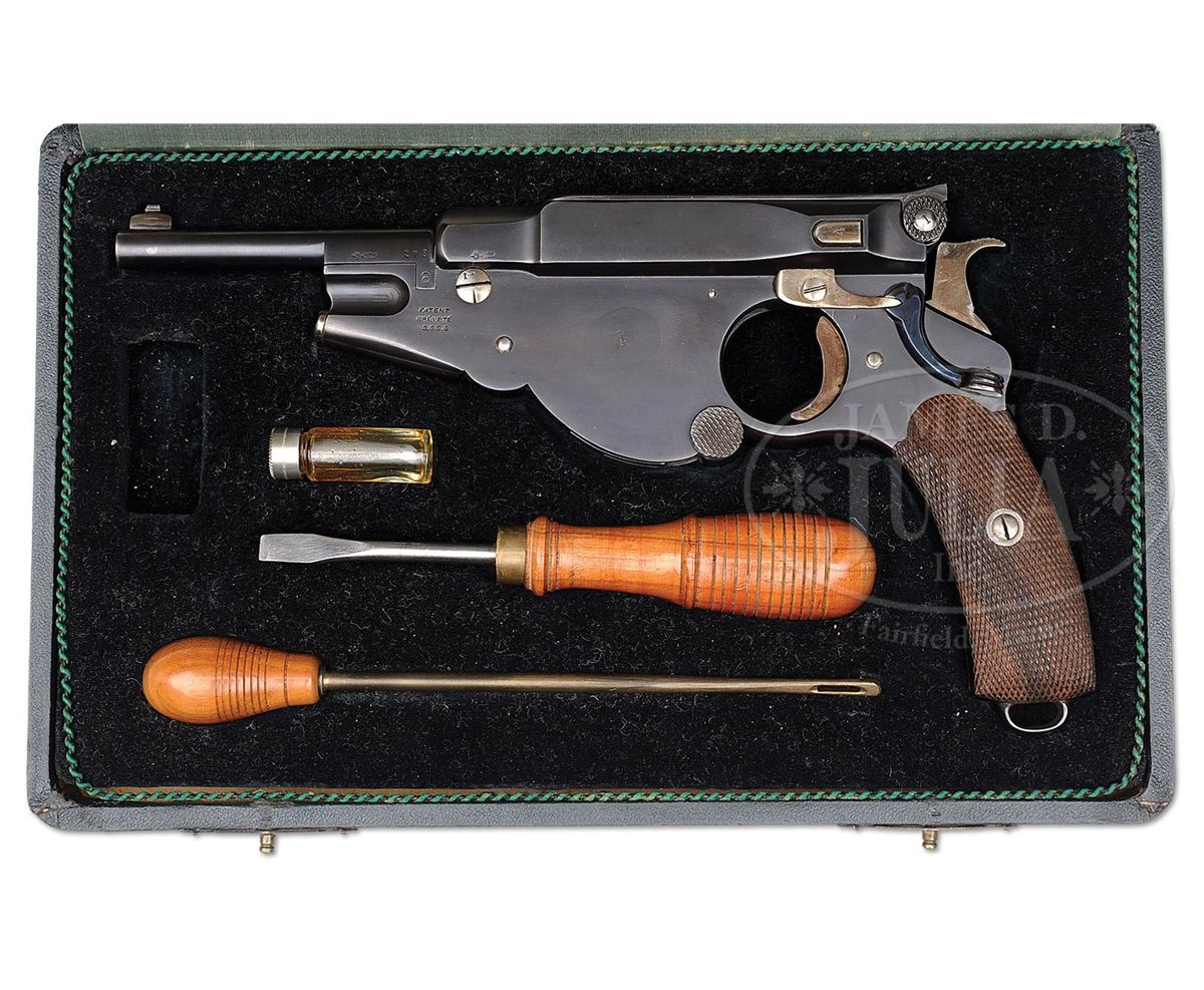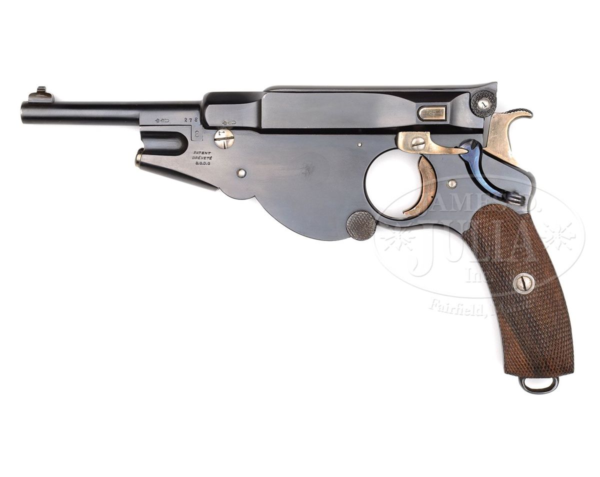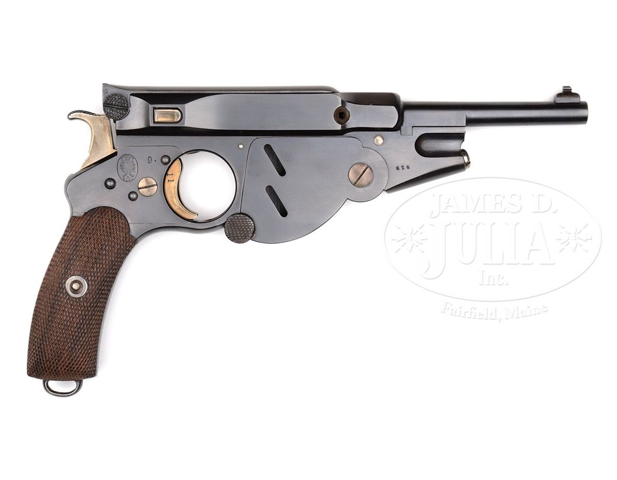 SN 414. Cal. 6.5mm Bergmann. This early M1894, Number 3, with hexagonal chamber, was made by the Bergmann company with no extractor, which characterises and differentiates the M1894 from the M1896 pistols that had an extractor, and a thin backstrap. Theodor Bergman was an early pioneer in the development of European semiautomatic pistols in the early 1890s and early 1900s. His early models were of distinctive design and had a silhouette that would never be confused with a competitor. All of the Number 2s, 3s and 4s, had an integral magazine that was loaded by rotating down the magazine sideplate and inserting a clip of cartridges from the side. This pistol has a 4.5" bbl, a fixed front sight and a fixed rear sight integral to the bolt that is affixed to a sliding cover over the ejection port. The lugged bbl is marked 278 on the left side (the bore gauge in the English system (no of lead balls of bore diameter (6.5 mm) to the pound) as used by the German proof houses from 1893 – 1912). Adjacent to this bore gauge number is the Crown/Crown/U proof marking that is repeated on the left side of the chamber. The left receiver, with short flutes, is marked "Patent Brevete S.G.D.G.". The SN 414 appears on the right side of the receiver, just below the flute. In the center of the sideplate is the Bergmann factory logo featuring a miner surmounted by the words "Gaggenau" and over V.C.S. Suhl. In this case, V.C.S. were the initials for V. Charles Schilling, who made the pistols for Bergmann and Suhl, which was their location. Walnut grips are finely checkered without a border and without a logo. The gun is presented in a dark green leather bound case, secured with two brass latches. The lid is silk lined and emblazoned with a Bergmann banner stipulating "Arme a repetition automatique/Bergmann Pistole/Bergmann's Self-loading Fire arm/made in Germany". The base of the case is lined in dark green velvet and bordered by a forest green cord. There is an empty partition for two clips. Other partitions contain a cleaning oil bottle and original tools with matching wooden handles that include a screwdriver and a brass stem cleaning rod. PROVENANCE: Dr. Geoffrey Sturgess Collection. CONDITION: Fantastic 98-99% bright blue, all original, with negligible sharp edge wear. There is no thinning of the front strap and only trace thinning of the backstrap. Virtually all the brilliant straw remains on the hammer, safety retainer, and trigger. Comparable high condition fire blued safety. Crisply checkered walnut grips with minimal darkening and no chips, cracks, or other losses. Mechanically perfect. Virtually all the varnish remains on the handles of the screwdriver and cleaning rod. This is an outstanding early Bergmann Number 3, with hexagonal chamber, cased with all accessories! 4-52205 LMA86