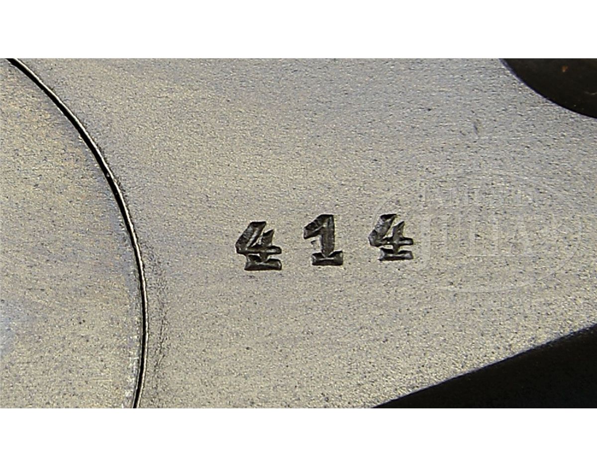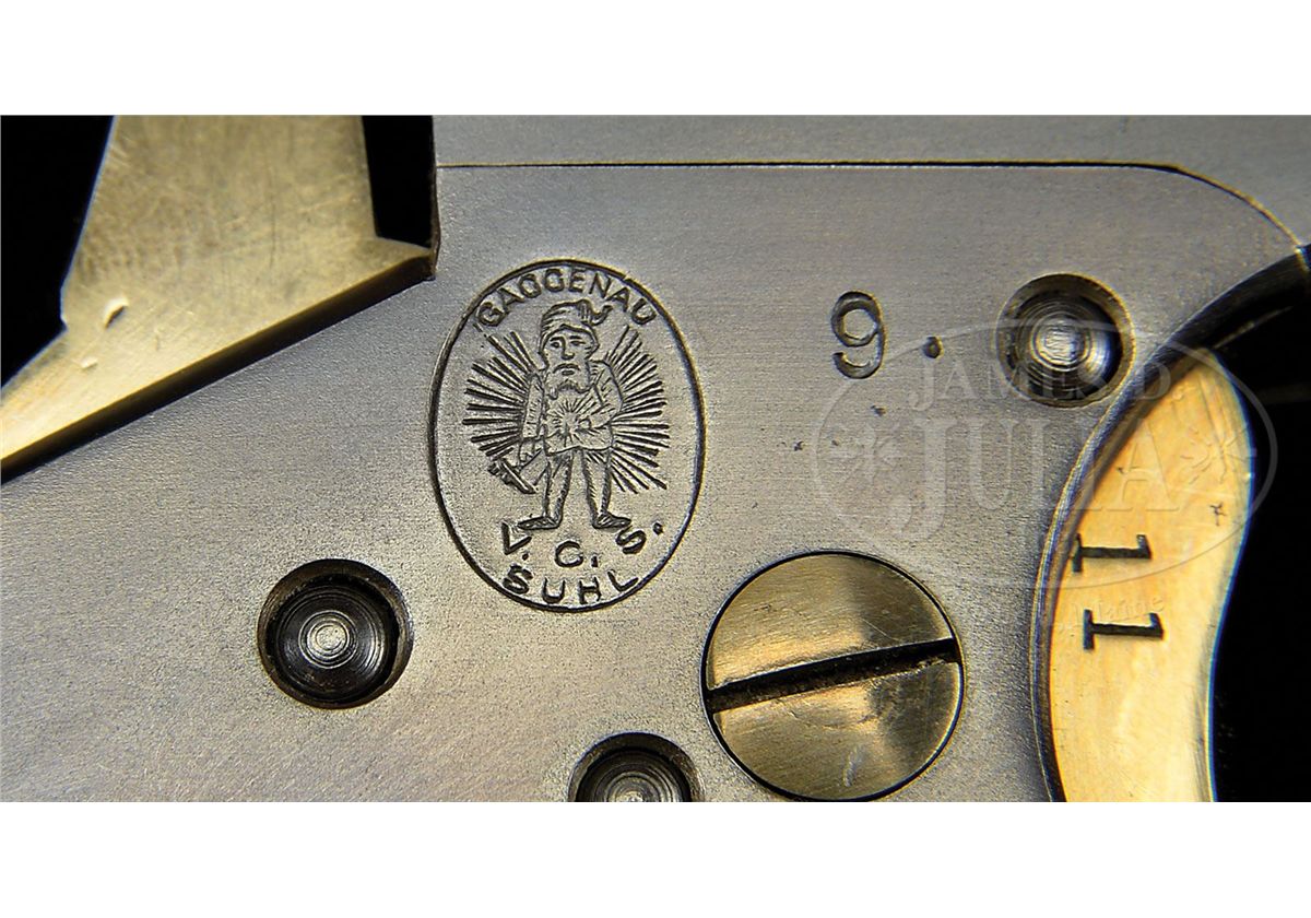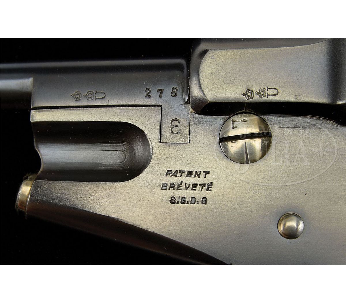 SN 414. Cal. 6.5mm Bergmann. This early M1894, Number 3, with hexagonal chamber, was made by the Bergmann company with no extractor, which characterises and differentiates the M1894 from the M1896 pistols that had an extractor, and a thin backstrap. Theodor Bergman was an early pioneer in the development of European semiautomatic pistols in the early 1890s and early 1900s. His early models were of distinctive design and had a silhouette that would never be confused with a competitor. All of the Number 2s, 3s and 4s, had an integral magazine that was loaded by rotating down the magazine sideplate and inserting a clip of cartridges from the side. This pistol has a 4.5" bbl, a fixed front sight and a fixed rear sight integral to the bolt that is affixed to a sliding cover over the ejection port. The lugged bbl is marked 278 on the left side (the bore gauge in the English system (no of lead balls of bore diameter (6.5 mm) to the pound) as used by the German proof houses from 1893 – 1912). Adjacent to this bore gauge number is the Crown/Crown/U proof marking that is repeated on the left side of the chamber. The left receiver, with short flutes, is marked "Patent Brevete S.G.D.G.". The SN 414 appears on the right side of the receiver, just below the flute. In the center of the sideplate is the Bergmann factory logo featuring a miner surmounted by the words "Gaggenau" and over V.C.S. Suhl. In this case, V.C.S. were the initials for V. Charles Schilling, who made the pistols for Bergmann and Suhl, which was their location. Walnut grips are finely checkered without a border and without a logo. The gun is presented in a dark green leather bound case, secured with two brass latches. The lid is silk lined and emblazoned with a Bergmann banner stipulating "Arme a repetition automatique/Bergmann Pistole/Bergmann's Self-loading Fire arm/made in Germany". The base of the case is lined in dark green velvet and bordered by a forest green cord. There is an empty partition for two clips. Other partitions contain a cleaning oil bottle and original tools with matching wooden handles that include a screwdriver and a brass stem cleaning rod. PROVENANCE: Dr. Geoffrey Sturgess Collection. CONDITION: Fantastic 98-99% bright blue, all original, with negligible sharp edge wear. There is no thinning of the front strap and only trace thinning of the backstrap. Virtually all the brilliant straw remains on the hammer, safety retainer, and trigger. Comparable high condition fire blued safety. Crisply checkered walnut grips with minimal darkening and no chips, cracks, or other losses. Mechanically perfect. Virtually all the varnish remains on the handles of the screwdriver and cleaning rod. This is an outstanding early Bergmann Number 3, with hexagonal chamber, cased with all accessories! 4-52205 LMA86