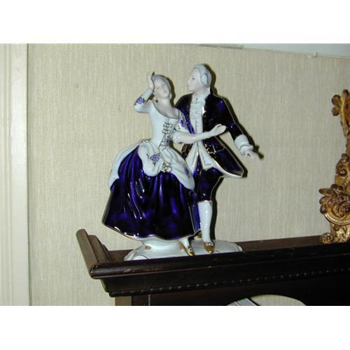 Absolutely gorgeous figural group of two lovers dressed in 18th century fashion. The blue of his coat and her dress has the most incredible depth.