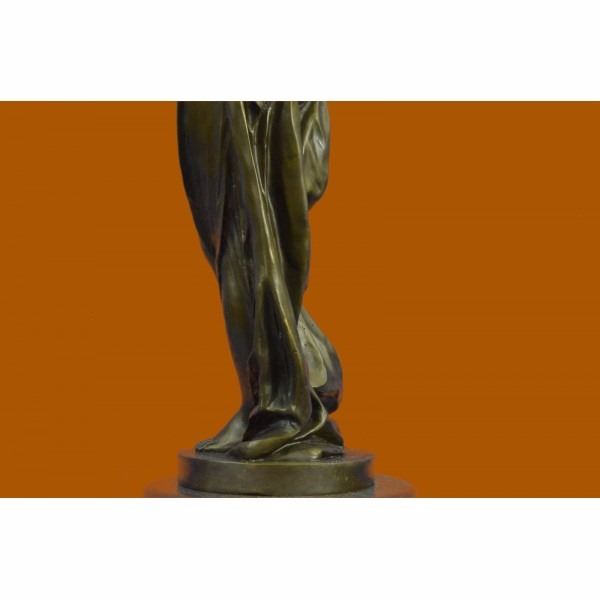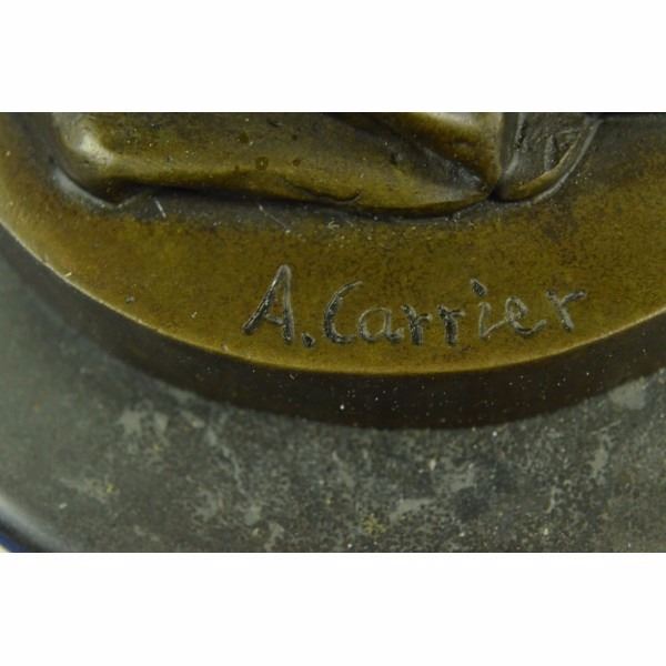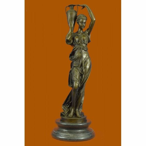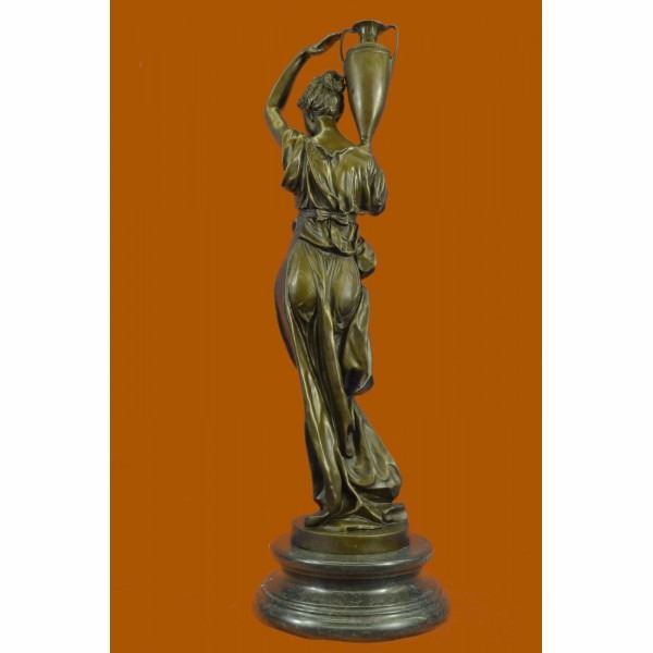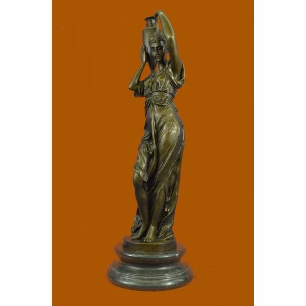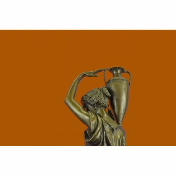 This statue is a conceptual representation of a Victorian woman standing. She carrying and holding a water jugs in her hand. She is clearly deep in thought, as her stern gaze stays fixed on a point ahead of her. Her hair cascades beautifully behind her in a manner that is actually fused with the structure of her body. This piece is slightly conceptual, as it focuses more on form rather than detail, as seen in the nonexistent details of her face, but that fact does not take away from the beauty of this piece. It features the lost wax method of casting, founded thousands of years ago, ensuring an exquisitely detailed sculpture and is signed by artist A.Carrier, that will add grace and beauty to your business or home. Condition: This sculpture is in perfect condition. Bronze Dimensions with Marble Base:Height 28" x Width 9" Marble Dimensions:Diameter 9" Height without base: 25" Weight : 35 LBS Inventory : 84YDZ040B14748