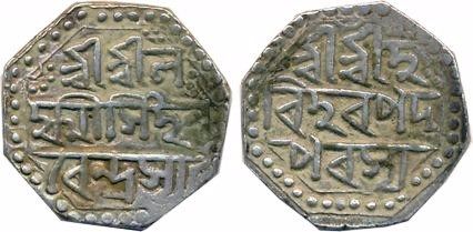 Lakshmi Simha, Silver 1/2 Rupee, 5.72g, "Hari Hara" type, Obv: "Sri Sri La/ksmi Simha Na/rendrasya", Rev: "Sri Sri Ha/ri Hara Pada/Parasya" (R&B# Q35.1). Extremely fine, rare.