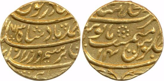 Ahmad Shah Durrani, Gold Mohur, 10.84g, Dar ul Khilafat Shahjahanabad Mint, AH 1173/ RY 14 (KM# 765). Very fine, very rare.
