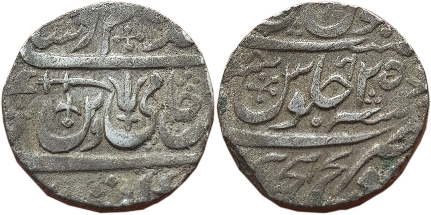 INDEPENDENT KINGDOMS,MARATHA CONFEDERACY: AR RUPEE, (11.1g, 19mm) , IN THE NAME OF SHAH ALAM II, KONCH HIJRI MINT, AH [119]8 / RY-25, NAGARI 'JA' AND MULTIPLE SYMBOLS, KM 175. UNCLEANED, ABOUT VERY FINE, SCARCE.