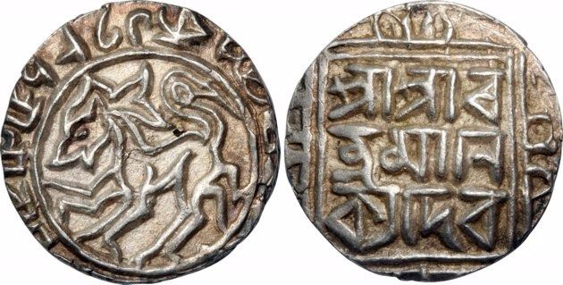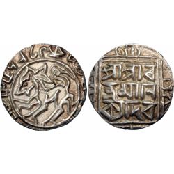 Ratna Manikya, Silver Tanka, 10.61g, SE 1386, Bengali legend on both sides, Obv: Lion facing left in linear form inside circle, Legend around, "Sri Narayana Charana Para Ratnapure 1386", Rev: "Sri Sri Ra/tna Mani/kya Deva" in double square and floral design outside (R&B# 9, KM# 6). Extremely fine, extremely rare.