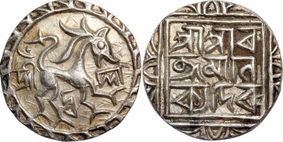 Ratna Manikya, Silver Tanka, 10.59g, Bengali legend on both sides, Obv: Solid lion to right, 'Sri Durga' below, toothed border, Rev: "Sri Sri Ra/tna Mani / kya Deva" in double square border, floral design outside (R&B# 31, KM# 22). Extremely fine, extremely rare.