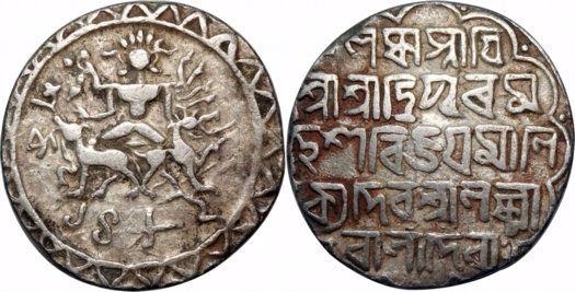 Vijaya Manikya, Silver Tanka, 10.43g, SE 1482, Ritual bath in River Lakhmia, Rev: Leg, Sri Lakshmi Rana Devi Figure of Ardhanarishvara, Obv: Figure of Ardhanarishvara, composed of half of the ten-handed Durga, seated on her lion and half of the four handed Shiva, seated on his bull, date Sake 1482 below, toothed border, Rev: Bengali legend Lakshyasnayi/Sri Sri Tripura Ma/heshVijaya Mani/kya Deva Sri Lakshmi/Rani Devyahwithin twelve arched scalloped border with beads between arches (R&B# 116, KM# 67). Very fine+, extremely rare.