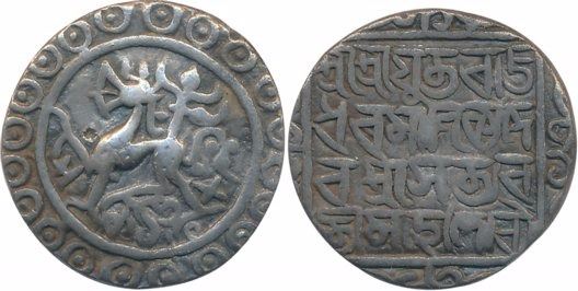 Rajdhara Manikya with Queen Satyavati, Silver Tanka, 10.38g, SE 1508, Obv: Lion facing left, with standard above, bead to right of the lion, date below, within circle with outer border of beaded annulets, Rev: Bengali legend "Sri Sri Yuta Raja/dhara Manikya De/va Sri Satyava/ti Maha Devyau" within square with ornamented borders (R&B# 179). Very fine+, rare.