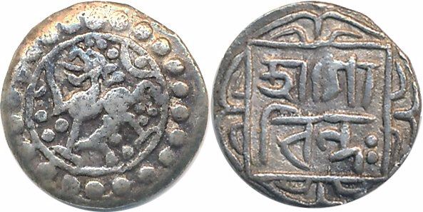 Govind Manikya, Silver 1/8 Tanka, 1.21g, Obv: Lion to left, Crescent & dot above within border of dots, Rev: "Sri Go/vindah" in two lines within square (R&B# 214). Very fine, rare.