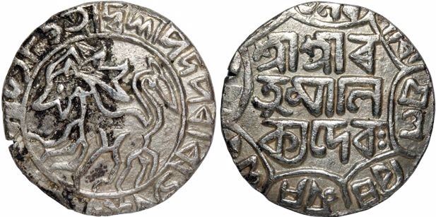 Ratna Manikya (1464-1489), Silver Tanka, 10.60g, SE 1386, Bengali legend on both sides, Obv: Lion to left, ''Sri Durga Pada Para Ratnapure Sake 1386'' reads clockwise, facing inward, Rev: ''Sri Sri Ra/tna Mani/kya Deva'' in cusped octagon with uncertain legend around ''Nara Narayana... yaha'' (KM# 15, R&B# 27). Best example known so far, extremely fine, extremely rare.