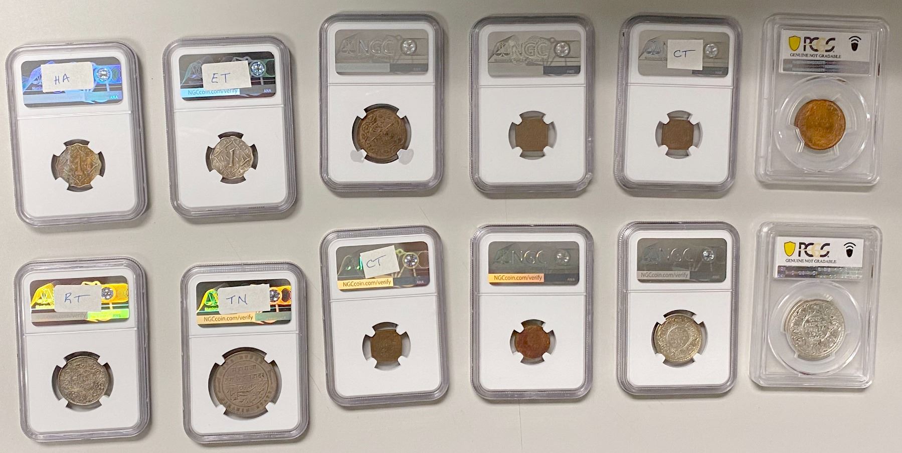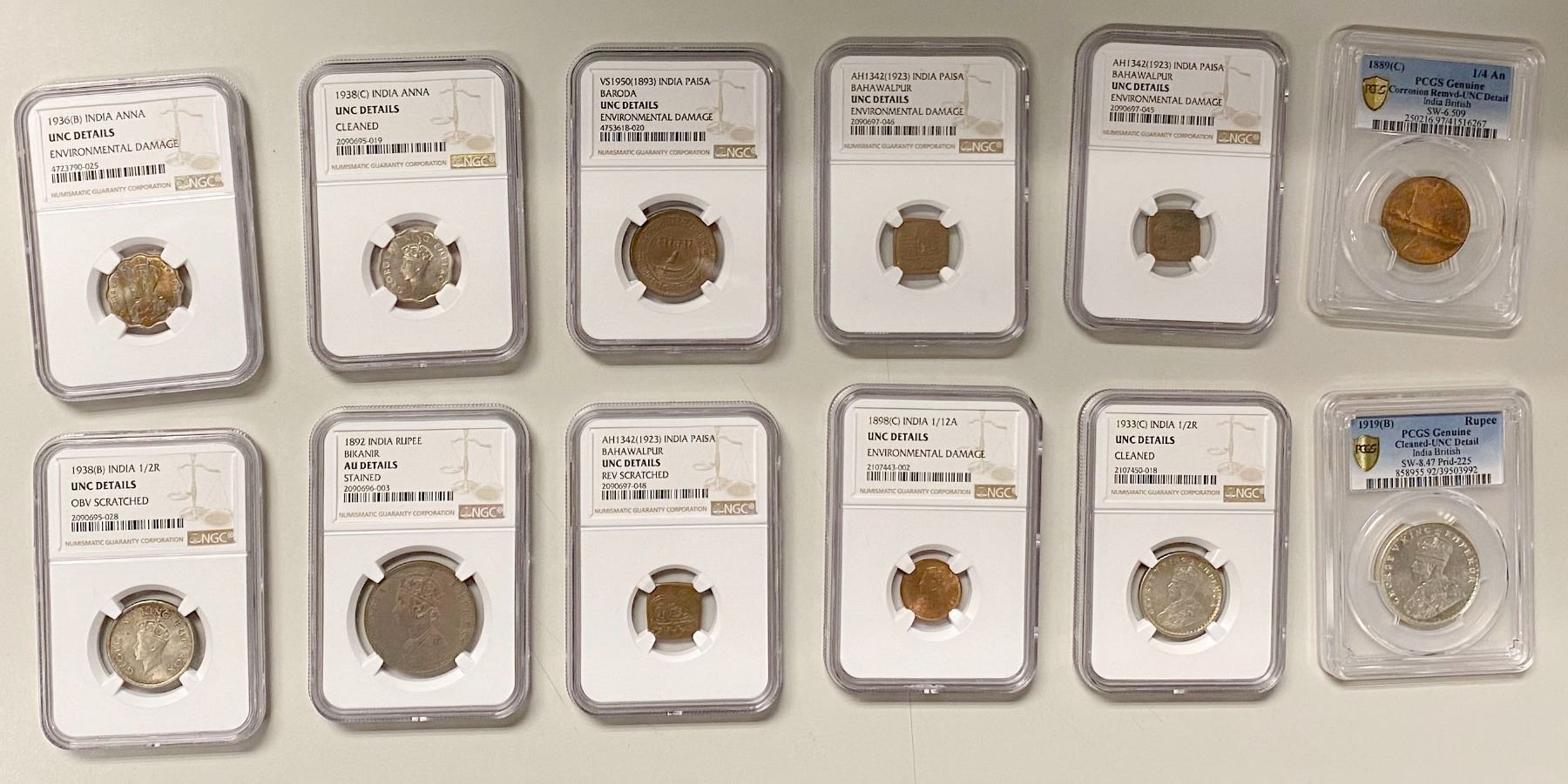 INDIA: LOT of 12 coins, all PCGS or NGC graded including: Bahawalpur 1 paisa AH1342 (3), Baroda 1 paisa VS1950 (1893), Bikanir 1 rupee 1892, British India 1/12 anna 1898(c), 1/4 anna 1899(c), 1 anna 1936(b), 1 anna 1938(c), 1/2 rupee 1933(c), 1/2 rupee 1938(b), 1 rupee 1919(b), all graded in 'details' holders although still a lovely group of mostly uncirculated coins, retail value $650, lot of 12 coins.