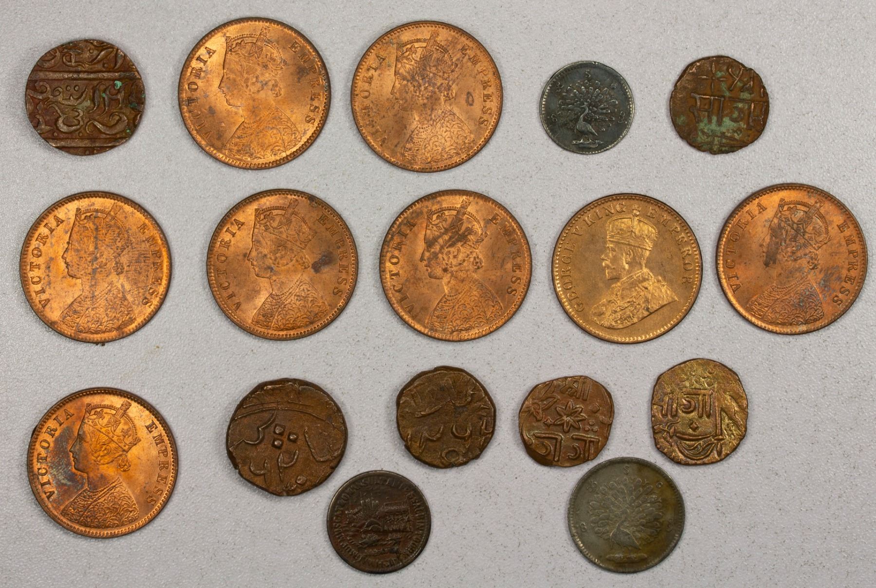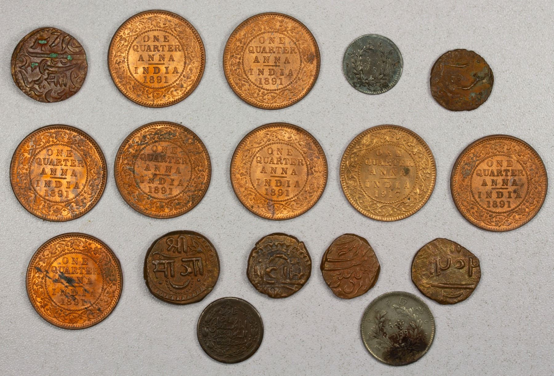 INDIA: LOT of 17 coins, a diverse and interesting lot of British India 1/4 anna 1891(c) red lustrous UNC (7), 1/4 anna 1917(c) red UNC (1), Baroda State high quality copper coins (6), Burma average quality silver 1 mu and 1 mat both dated CS1214 (1852) and Muscat & Oman 1/12 anna AH1311 in VF-EF condition, retail value $550, lot of 17 coins.