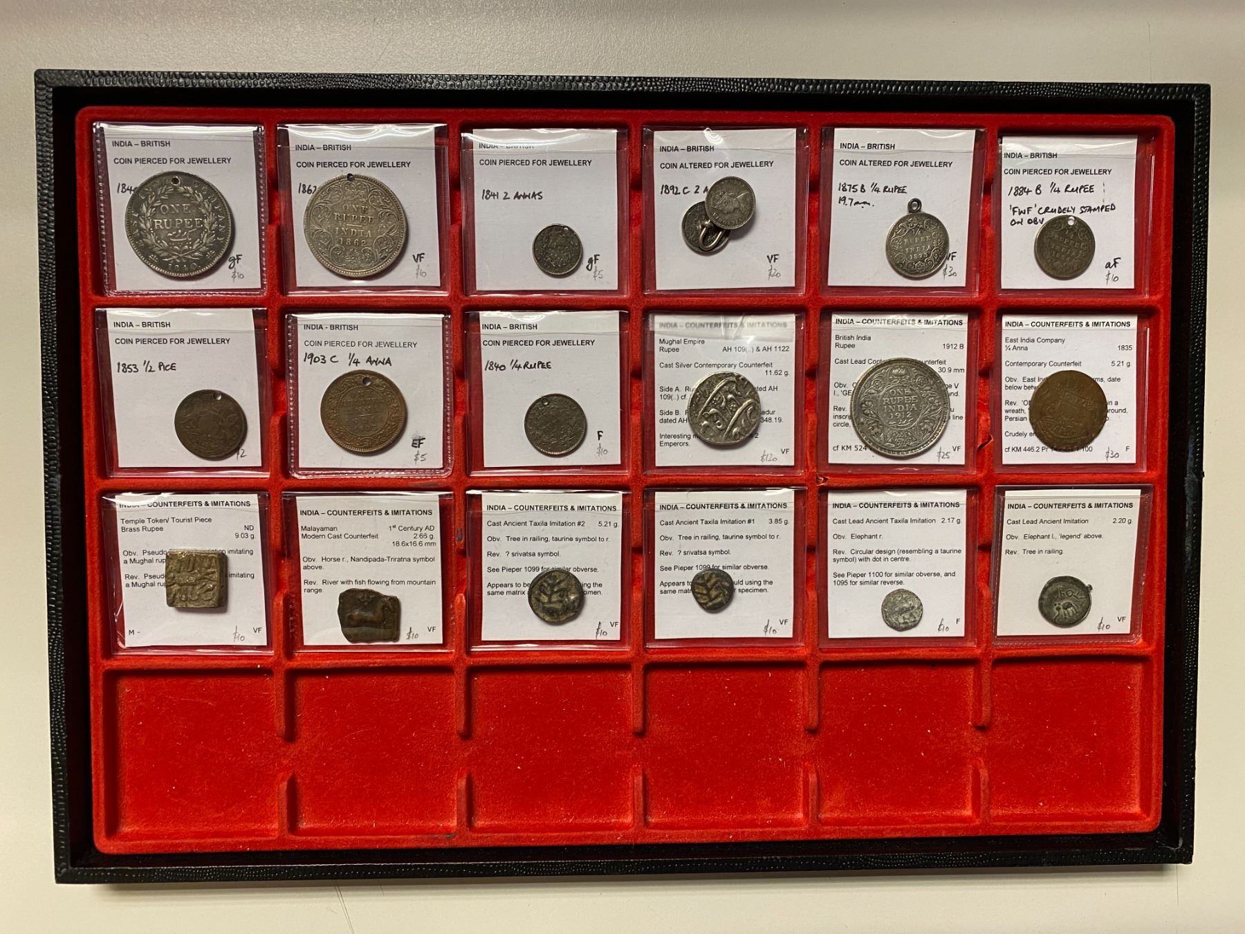 INDIA: LOT of 19 pieces, Contemporary forgernies or imitations: Silver: (2) cast 1912 British India rupee and cast mule of 2 obverses of Aurangzeb & Saha Alam I; and Base Metals: 3 copper comtemporary forgeries (18th/19th century), and 4 ancient lead contemporary imititions; and Jeweler's adjustments: British India piece either pierced or with mount, 7 silver (all of Victoria) and 3 copper coins; retail value $250, all with Ian Todd's description lot of 19 pieces.